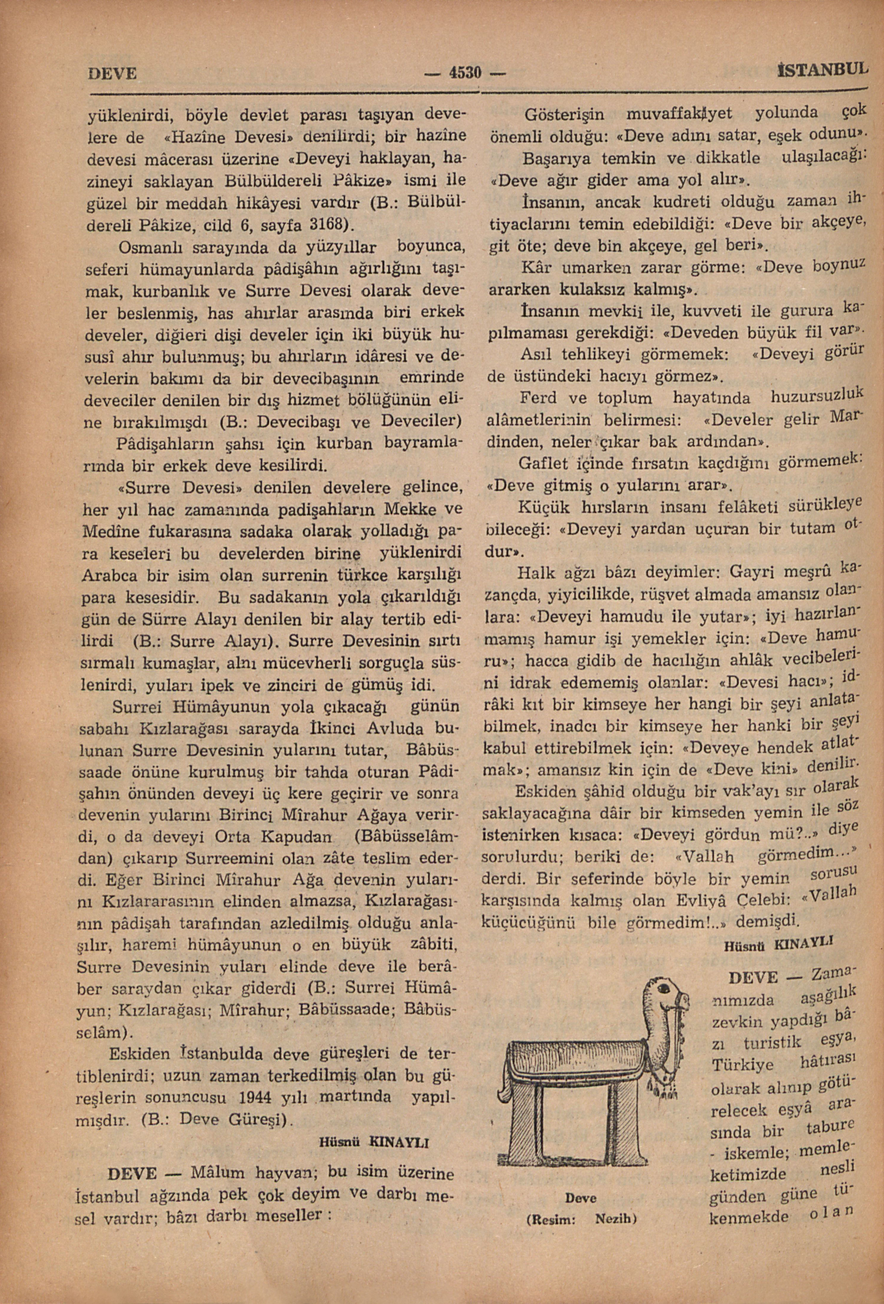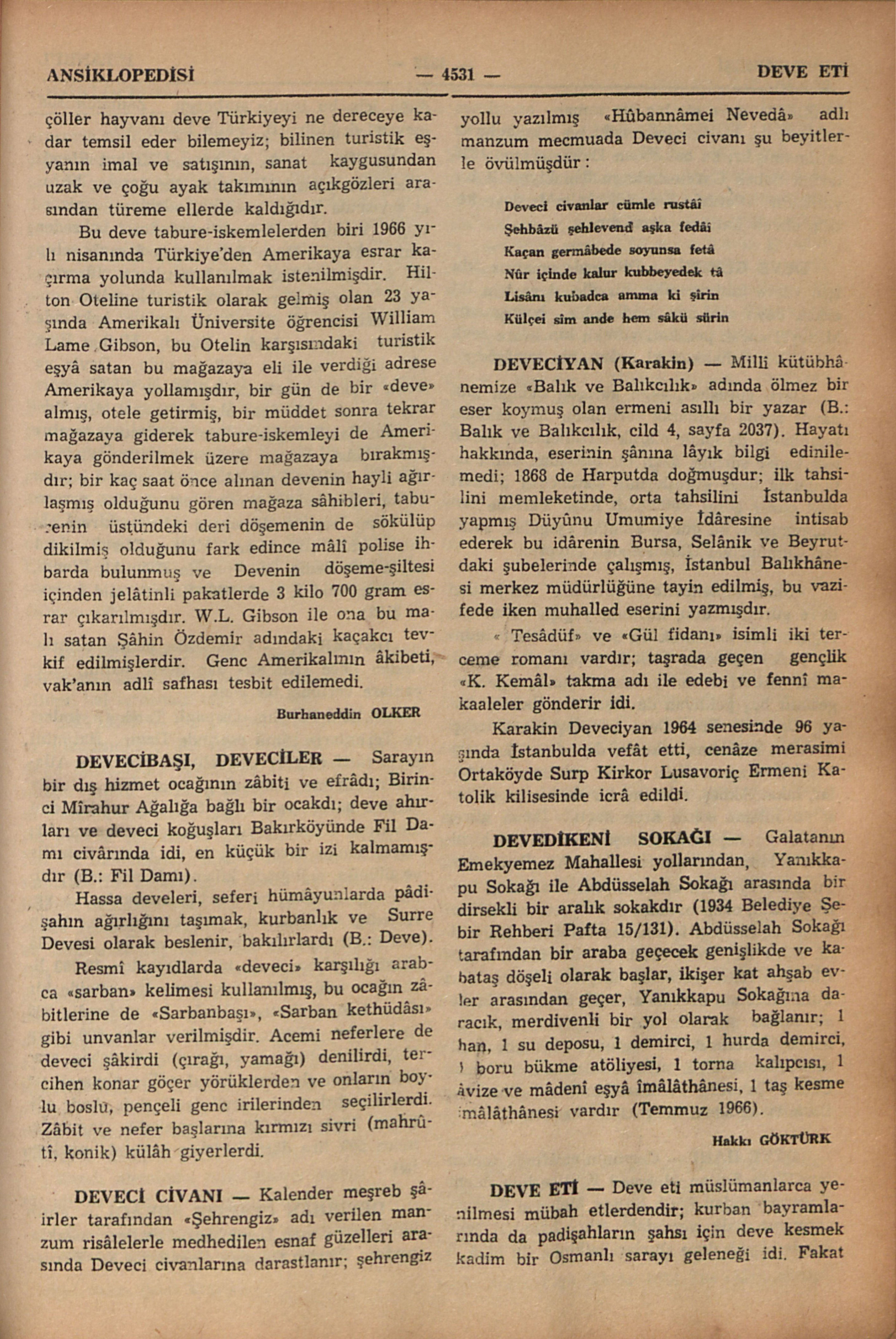 Zamanımızda aşağılık zevkin yapdığı bâzı turistik eşya, Türkiye hâtırası olarak alınıp götürecek eşyâ arasında bir tabure - iskemle; memleketimizde nesli günden güne tükenmekde olan çöller hayvanı deve Türkiyeyi ne dereceye kadar temsil eder bilemeyiz; bilinen turistik eşyanın imal ve satışının, sanat kaygusundan uzak ve çoğu ayak takımının açıkgözleri arasından türeme ellerde kaldığıdır. Bu deve tabure-iskemlelerden biri 1966 yılı nisanında Türkiye’den Amerikaya esrar kaçırma yolunda kullanılmak istenilmişdir. Hilton Oteline turistik olarak gelmiş olan 23 yaşında Amerikalı Üniversite öğrencisi William Lame Gibson, bu Otelin karşısındaki turistik eşyâ satan bu mağazaya eli ile verdiği adrese Amerikaya yollamışdır, bir gün de bir “deve” almış, otele getirmiş, bir müddet sonra tekrar mağazaya giderek tabure-iskemleyi de Amerikaya gönderilmek üzere mağazaya bırakmışdır; bir kaç saat önce alınan devenin hayli ağırlaşmış olduğunu gören mağaza sâhibleri, taburenin üstündeki deri döşemenin de sökülüp dikilmiş olduğunu fark edince mâlî polise ihbarda bulunmuş ve Devenin döşeme-şiltesi içinden jelâtinli pakatlerde 3 kilo 700 gram esrar çıkarılmışdır. W.L. Gibson ile ona bu malı satan Şâhin Özdemir adındaki kaçakcı tevkif edilmişlerdir. Genc Amerikalının âkibeti, vak’anın adlî safhası tes...