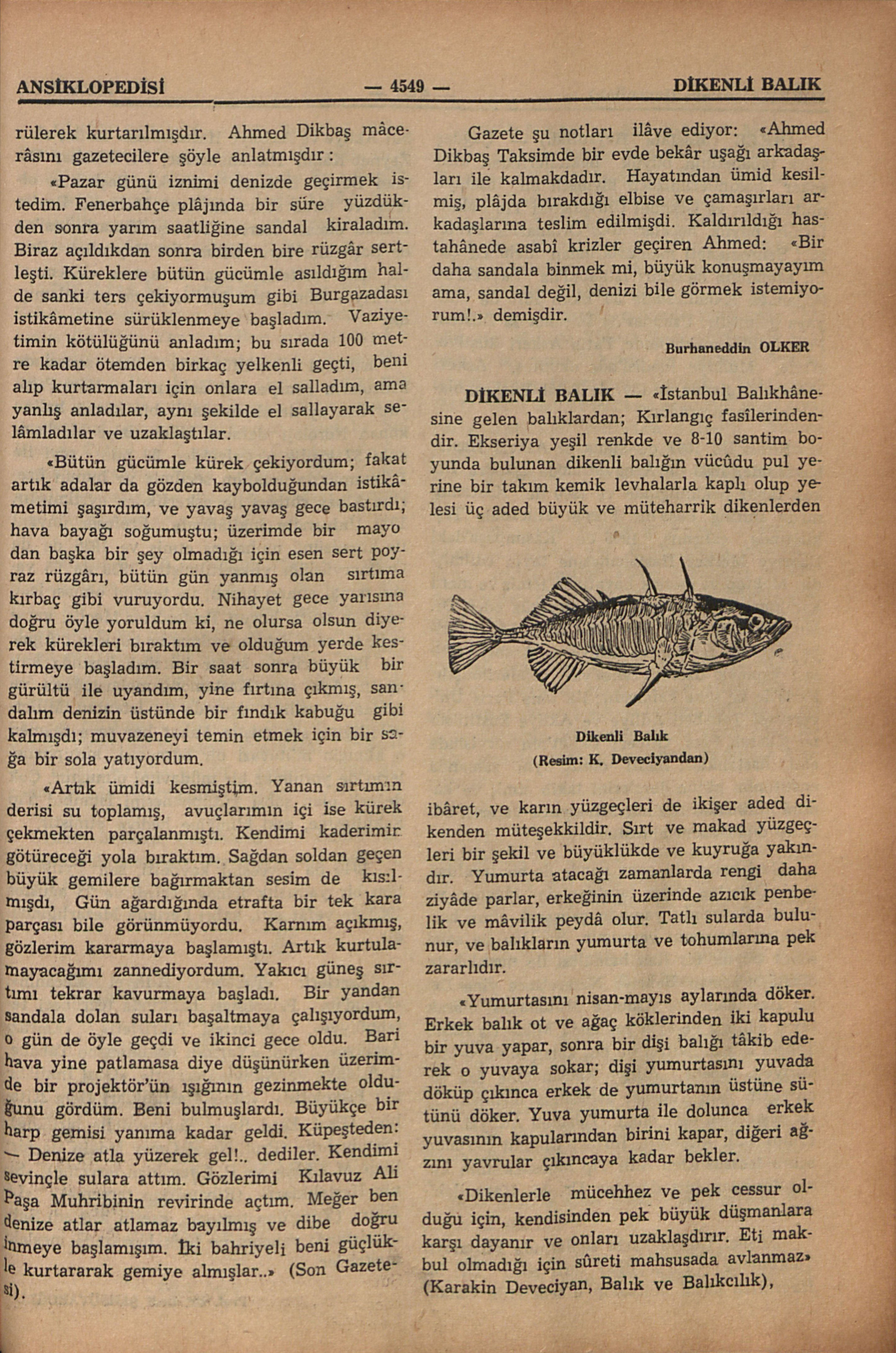 1966 yazında irâdesi dışında hayatına mal olacak büyük bir mâcerânın kahramanı olmuş 16 yaşında esnaf çırağı bir küçük delikanlı; 7 ağustos pazar günü Fenerbağçe Plâjından kiraladığı sandalla denize açıldıkdan sonra ânî olarak kopan fırtınaya tutulmuş; rüzgârla, dalgalarla, akıntı ile Marmara Adasına kadar sürüklenerek 42 saat aç ve susuz denizde kalmış ve ikinci gece içinde “Kılavuz Ali Paşa” muhribi tarafından görülerek kurtarılmışdır. Ahmed Dikbaş mâcerâsını gazetecilere şöyle anlatmışdır : “Pazar günü iznimi denizde geçirmek istedim. Fenerbahçe plâjında bir süre yüzdükden sonra yarım saatliğine sandal kiraladım. Biraz açıldıkdan sonra birden bire rüzgâr sertleşti. Küreklere bütün gücümle asıldığım halde sanki ters çekiyormuşum gibi Burgazadası istikâmetine sürüklenmeye başladım. Vaziyetimin kötülüğünü anladım; bu sırada 100 metre kadar ötemden birkaç yelkenli geçti, beni alıp kurtarmaları için onlara el salladım, ama yanlış anladılar, aynı şekilde el sallayarak selâmaldılar ve uzaklaştılar. “Bütün gücümle kürek çekiyordum; fakat artık adalar da gözden kaybolduğundan istikâmetimi şaşırdım, ve yavaş yavaş gece bastırdı; hava bayağı soğumuştu; üzerimde bir mayodan başka bir şey olmadığı için eser sert poyraz rüzgârı, bütün gün yanmış olan sırtıma kırbaç gibi vuruyordu. Nihayet gece yarısına doğru öyle yoruldum ki, ne olursa olsun diyerek kürekleri bıraktım ve olduğum yerde kestirmeye başladım. Bir saat sonra büyük bir gürültü ile uyandım, yine fırtına çıkmış, sandalım denizin üstünde bir fındık kabuğu gibi kalmışdı; muvazeneyi temin etmek için bir sağa bir sola yatıyordum. “Artık ümidi kesmiştim. Yanan sırtımın derisi su toplamış, avuçlarımın içi ise kürek çekmekten parçalanmıştı. Kendimi kaderimin götüreceği yola bıraktım. Sağdan soldan geçen büyük gemilere bağırmaktan sesim de kısılmışdı, Gün ağardığında etrafta bir tek kara parçası bile görünmüyordu. Karnım acıkmış, gözlerim kararmaya başlamıştı. Artık kurtulamayacağımı zannediyordum. Yakıcı güneş sırtımı tekrar kavurmaya başladı. Bir yandan sandala dolan suları boşaltmaya çalışıyordum, o gün de öyle geçdi ve ikinci gece oldu. Bari hava yine patlamasa diye düşünürken üzerimde bir projektör’ün ışığının gezinmekte olduğunu gördüm. Beni bulmuşlardı. Büyükçe bir harp gemisi yanıma kadar geldi. Küpeşteden:— Denize atla yüzerek gel!.. dediler. Kendimi sevinçle sulara attım. Gözlerimi Kılavuz Ali Paşa Muhribinin revirinde açtım. Meğer ben denize atlar atlamaz bayılmış ve dibe doğru inmeye başlamışım. İki bahriyeli beni güçlükle kurtararak gemiye almışlar..” (Son Gazetesi). Gazete şu notları ilâve ediyor: “Ahmed Dikbaş Taksimde bir evde bekâr uşağı arkadaşları ile kalmakdadır. Hayatından ümid kesilmiş, plâjda bırakdığı elbise ve çamaşırları arkadaşlarına teslim edilmişdi. Kaldırıldığı hastahânede asabî krizler geçiren Ahmed: “Bir daha sandala binmek mi, büyük konuşmayayım ama, sandal değil, denizi bile görmek istemiyorum!.” demiştir. Burhaneddin OLKER Ahmed Dikbaşın macerâsı Son Gazetesi yaprağında