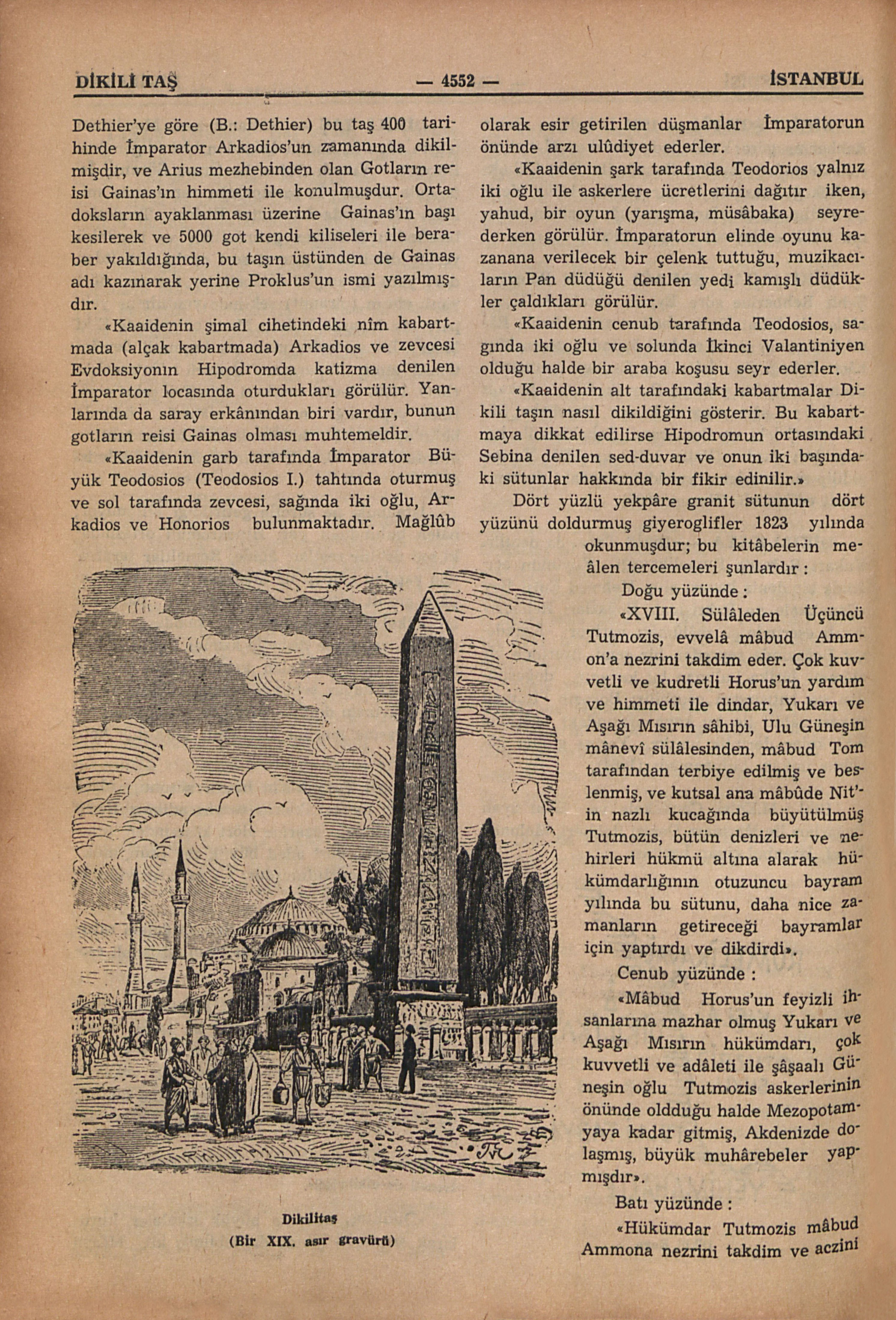 “Dikilitaş, etrafına büyük iskeleler kurularak ancak 32 günde dikilebilmiş idi. Mösyö Dethier’ye göre (B.: Dethier) bu taş 400 tarihinde İmparator Arkadios’un zamanında dikilmişdir ve Arius mezhebinden olan Gotların reisi Gainas’ın himmeti ile konulmuşdur. Ortadoksların ayaklanması üzerine Gainas’ın başı kesilerek ve 5000 got kendi kiliseleri ile beraber yakıldığında, bu taşın üstünden de Gainas adı kazınarak yerine Proklus’un ismi yazılmışdır.