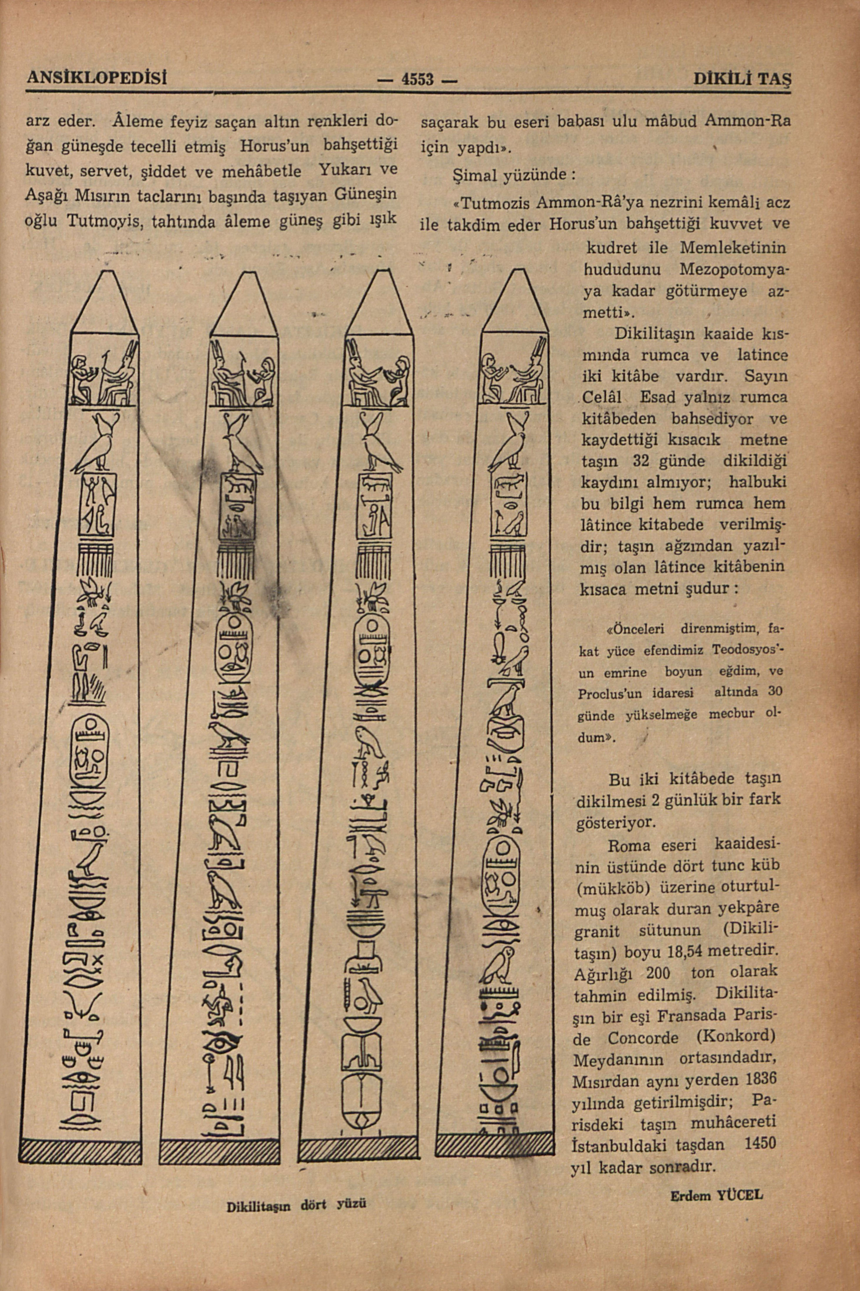 “XVIII. Sülâleden Üçüncü Tutmozis, evvelâ mâbud Ammon’a nezrini takdim eder. Çok kuvvetli ve kudretli Horus’un yardım ve himmeti ile dindar, Yukarı ve Aşağı Mısırın sâhibi, Ulu Güneşin mânevî sülâlesinden, mâbud Tom tarafından terbiye edilmiş ve beslenmiş ve kutsal ana mâbûde Nit’in nazlı kucağında büyütülmüş Tutmozis, bütün denizleri ve nehirleri hükmü altına alarak hükümdarlığının otuzuncu bayram yılında bu sütunu, daha nice zamanların getireceği bayramlar için yaptırdı ve dikdirdi”.