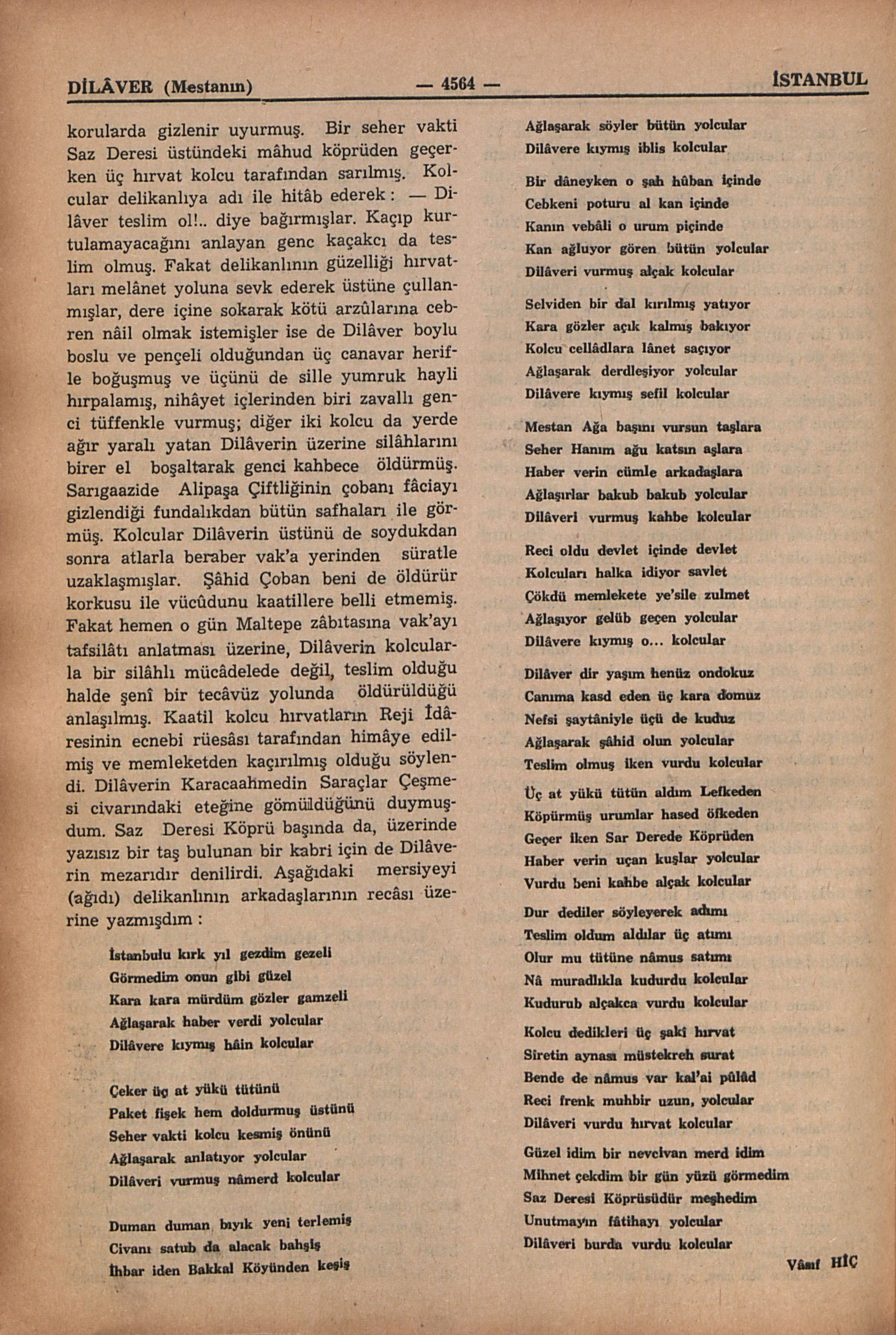 1317 (1899-1900) de Üsküdarda Rumeli muhâcirlerinden Mestan Ağa adında fakir bir seyyar berberin oğlu ondokuz yaşında gaayetle dilber bir delikanlı idi. Tütün kaçakcılığı yoluna sapdı. Büyük bir kaçakcı şebekesinin malı olarak Merdiven Köyünde yâhud İçerenköyünde birine teslim edilmek üzere Lefkeden üç at yükü tütün getirirken oranın rumları atlı bir ulak çıkarıp reji kolcularına ihbar etmesi için Büyük Bakkal Köyü papazına haber yollamışlar, papazın ihbârı üzrine de üç nefer hırvat kolcu, kaçakcıların dâimâ tercih ettikleri yolda, Samandıra ile Sarıgaazi arasında Saz Deresi üzerindeki harab köprüde pusu kurmuşlar. Dilâver geceleri yol alır, gündüzleri ıssız dere yataklarında, korularda gizlenir uyurmuş. Bir seher vakti Saz Deresi üstündeki mâhud köprüden geçerken üç hırvat kolcu tarafından sarılmış. Kolcular delikanlıya adı ile hitâb ederek: — Dilâver teslim ol!.. diye bağırmışlar. Kaçıp kurtulamayacağını anlayan genç kaçakçı da teslim olmuş. Fakat delikanlının güzelliği hırvatları melânet yoluna sevk ederek üstüne çullanmışlar, dere içine sokarak kötü arzûlarına cebren nâil olmak istemişler ise de Dilâver boylu boslu ve pençeli olduğundan üç canavar herifle boğuşmuş ve üçüncü de sille yumruk hayli hırpalamış, nihâyet içlerinden biri zavallı genci tüffenkle vurmuş; diğer iki kolcu da yerde ağır yaralı yatan Dilâverin üzerine silâhlarını birer el boşaltarak genci kahbece öldürmüş. Sarıgaazide Alipaşa Çiftliğinin çobanı fâciayı gizlendiği fundalıkdan bütün safhaları ile görmüş. Kolcular Dilâverin üstüne de soydukdan sonra atlarla beraber vak’a yerinden süratle uzaklaşmışlar. Şâhid Çoban beni de öldürür korkusu ile vücûdunu kaatillere belli etmemiş. Fakat hemen o gün Maltepe zâbıtasına vak’ayı tafsilâtı anlatması üzerine, Dilâverin kolcularla bir silâhı mücâdelede değil, teslim olduğu halde şenî bir tecâvüz yolunda öldürüldüğü anlaşılmış. Kaatil kolcu hırvatların Reji İdâresinin ecnebi rüesâsı tarafından himâye edilmiş ve memleketden kaçırılmış olduğu söylendi. Dilâverin Karacaahmedin Saraçlar Çeşmesi civarındaki eteğine gömüldüğünü duymuşdum. Saz Deresi Köprü başında da, üzerinde yazısız bir taş bulunan bir kabri için de Dilâverin mezarıdır denilirdi. Aşağıdaki mersiyeyi (ağıdı) delikanlının arkadaşlarının recâsı üzerine yazmışdım:
