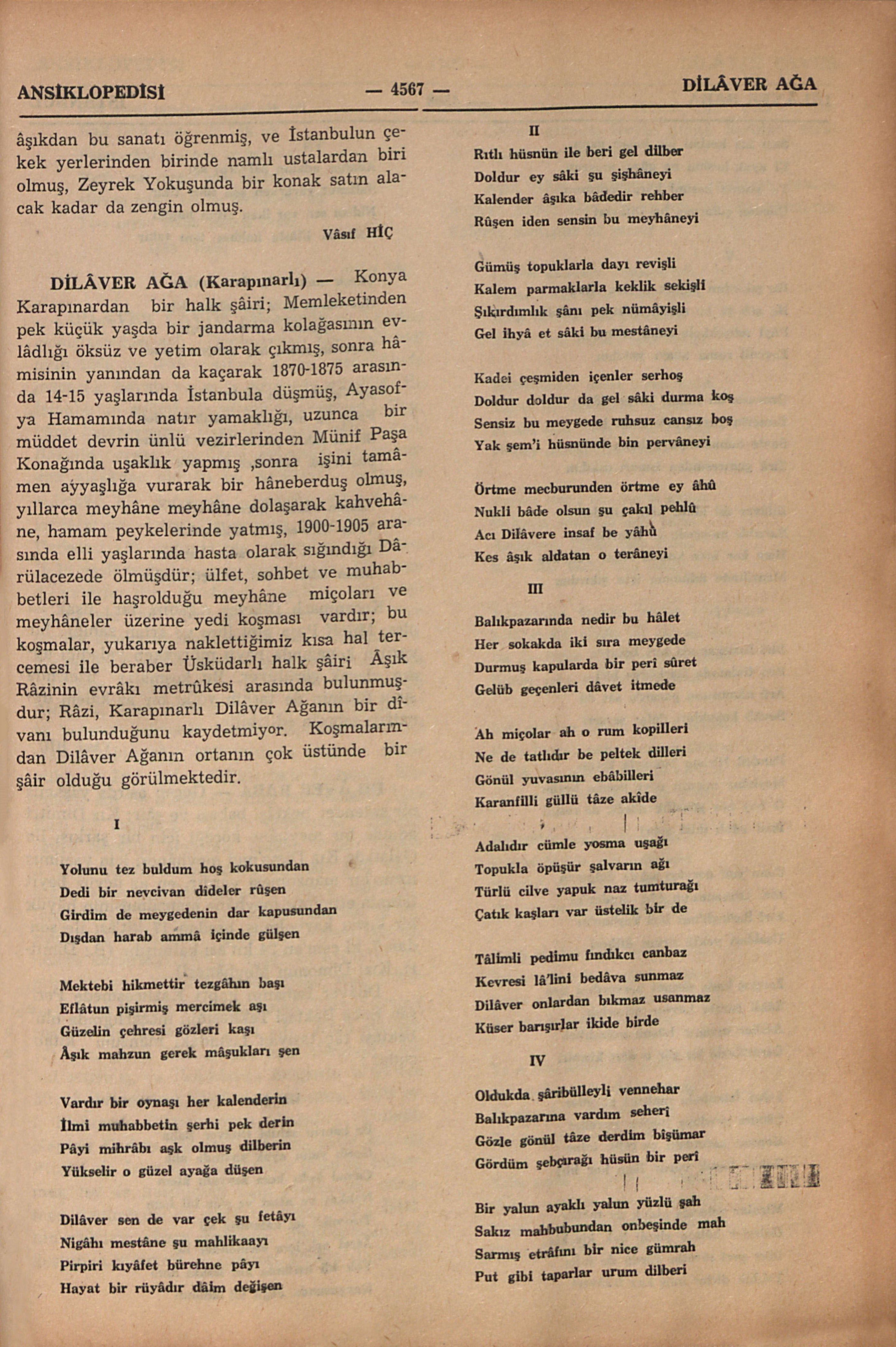 Konya Karapınardan bir halk şâiri; Memleketinden pek küçük yaşda bir jandarma kolağasının evlâdlığı öksüz ve yetim olarak çıkmış, sonra hâmisinin yanından da kaçarak 1870-1875 arasında 14-15 yaşlarında İstanbula düşmüş, Ayasofya Hamamında natır yamaklığı, uzunca bir müddet devrin ünlü vezirlerinden Münif Paşa Konağında uşaklık yapmış, sonra işini tamâmen ayyaşlığa vurarak bir hâneberduş olmuş, yıllarca meyhâne meyhâne dolaşarak kahvehâne, hamam peykelerinde yatmış, 1900-1905 arasında elli yaşlarında hasta olarak sığındığı Dârülacezede ölmüşdür; ülfet, sohbet ve muhabbetleri ile haşrolduğu meyhâne miçoları ve meyhâneler üzerine yedi koşması vardır; bu koşmalar, yukarıya naklettiğimiz kısa hal tercemesi ile beraber Üsküdarlı halk şâiri Âşık Râzinin evrâkı metrûkesi arasında bulunmuşdur; Râzi, Karapınarlı Dilâver Ağanın bir dîvanı bulunduğunu kaydetmiyor. Koşmalarından Dilâver Ağanın ortanın çok üstünde bir şâir olduğu görülmektedir.