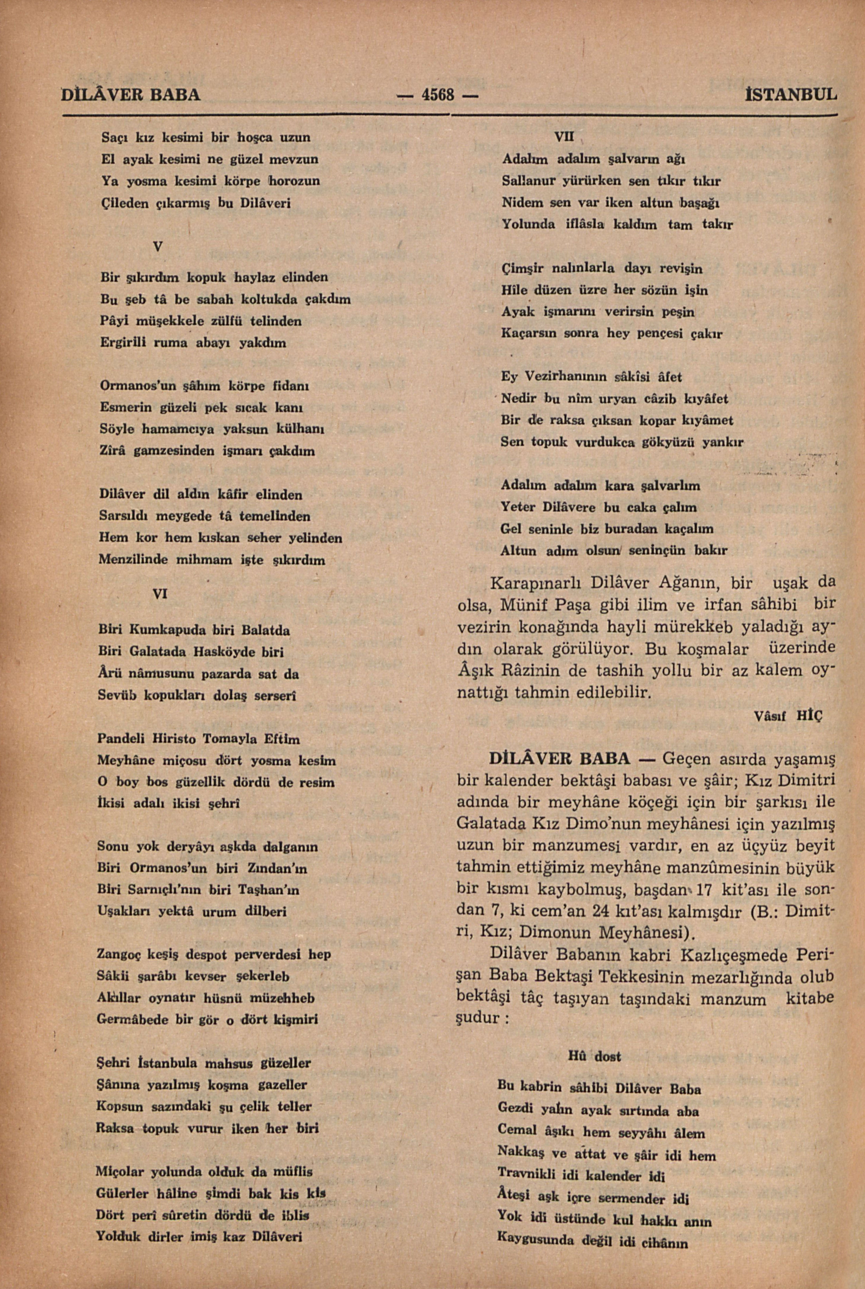 Geçen asırda yaşamış bir kalender bektâşi babası ve şâir; Kız Dimitri adında bir meyhâne köçeği için bir şarkısı ile Galatada Kız Dimo’nun meyhânesi için yazılmış uzun bir manzumesi vardır, en az üçyüz beyit tahmin ettiğimiz meyhâne manzûmesinin büyük bir kısmı kaybolmuş, başdan 17 kit’ası ile sondan 7, ki cem’an 24 kıt’ası kalmışdır (B.: Dimitri, Kız; Dimonun Meyhânesi).