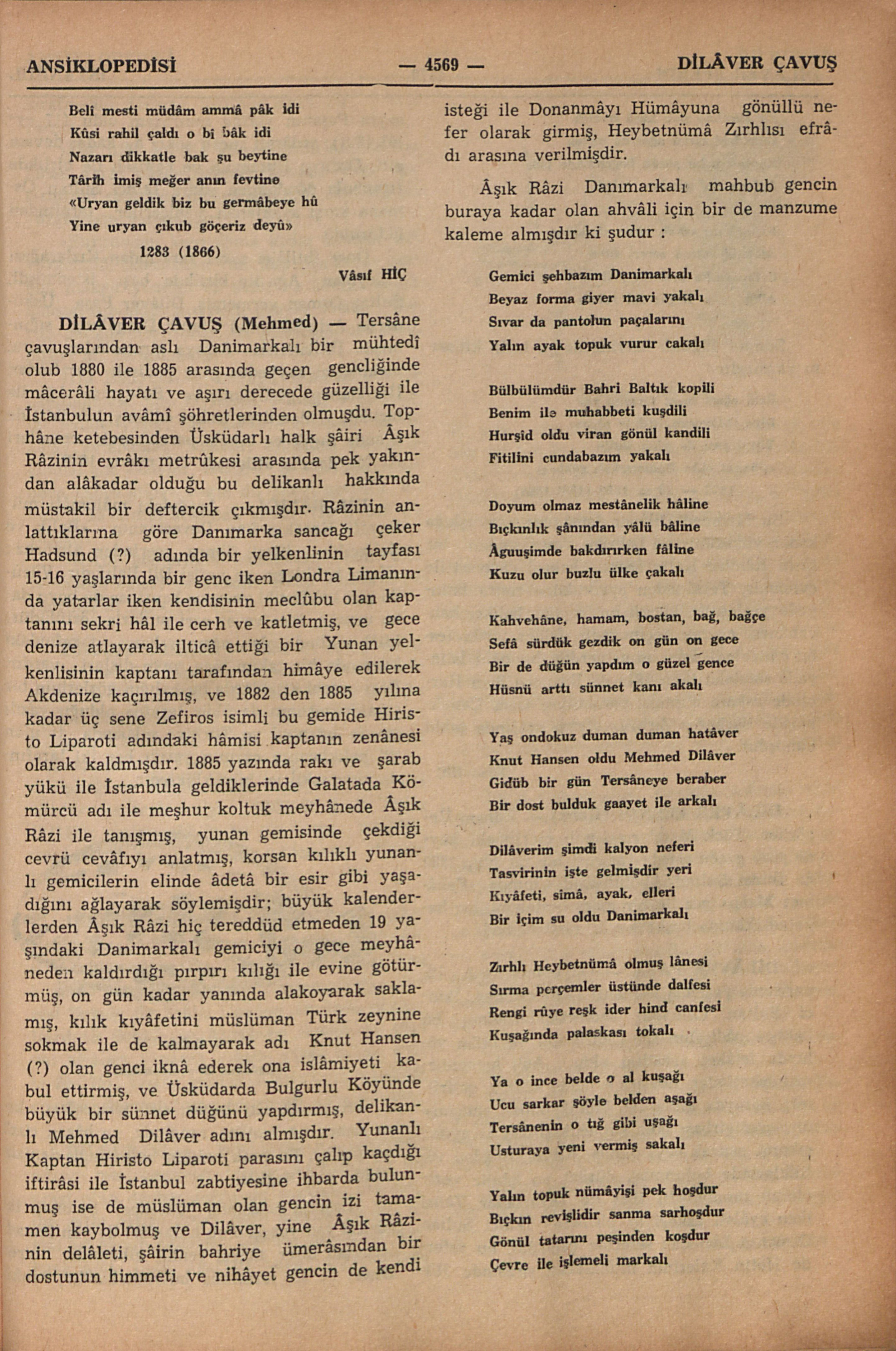 Tersâne çavuşlarından aslı Danimarkalı bir mühtedî olub 1880 ile 1885 arasında geçen gençliğinde mâcerâli hayatı ve aşırı derecede güzelliği ile İstanbulun avâmî şöhretlerinden olmuşdu. Tophâne ketebesinden Üsküdarlı halk şâiri Âşık Râzinin evrâkı metrûkesi arasında pek yakından alâkadar olduğu bu delikanlı hakkında müstakil bir deftercik çıkmışdır. Râzinin anlattıklarına göre Danimarka sancağı çeker Hadsund (?) adında bir yelkenlinin tayfası 15-16 yaşlarında bir genç iken Londra Limanında yatarlar iken kendisinin meclûbu olan kaptanını sekri hâli ile cerh ve katletmiş ve gece denize atlayarak ilticâ ettiği bir Yunan yelkenlisinin kaptanı tarafından nimâye edilerek Akdenize kaçırılmış ve 1882 den 1885 yılına kadar üç sene Zefiros isimli bu gemide Hiristo Liparoti adındaki hâmisi kaptanın zenânesi olarak kaldmışdır. 1885 yazında rakı ve şarab yükü ile İstanbula geldiklerinde Galatada Kömürcü adı ile meşhur koltuk meyhânede Âşık Râzi ile tanışmış, yunan gemisinde çekdiği cevrü cevâfıyı anlatmış, korsan kılıklı yunanlı gemicilerin elinde âdetâ bir esir gibi yaşadığını ağlayarak söylemişdir; büyük kalenderlerden Âşık Râzi hiç tereddüd etmeden 19 yaşındaki Danimarkalı gemiciyi o gece meyhâneden kaldırdığı pırpırı kılığı ile evine götürmüş, on gün kadar yanında alakoyarak saklamış, kılık kıyâfetini müslüman Türk zeynine sokmak ile de kalmayarak adı Knut Hanser (?) olan genci iknâ ederek ona islâmiyeti kabul ettirmiş ve Üsküdar’da Bulgurlu Köyünde büyük bir sünnet düğünü yaptırmış, delikanlı Mehmed Dilâver adını almıştır. Yunanlı Kaptan Hiristo Liparoti parasını çalıp kaçdığı iftirâsi ile İstanbul zabtiyesine ihbarda bulunmuş ise de müslüman olan gencin izi tamamen kaybolmuş ve Dilâver, yine Âşık Râzinin delâleti, şâirin bahriye ümerâsından bir dostunun himmeti ve nihâyet gencin de kendi isteği ile Donanmâyı Hümâyuna gönüllü nefer olarak girmiş, Heybetnümâ Zırhlısı efrâdı arasına verilmişdir.