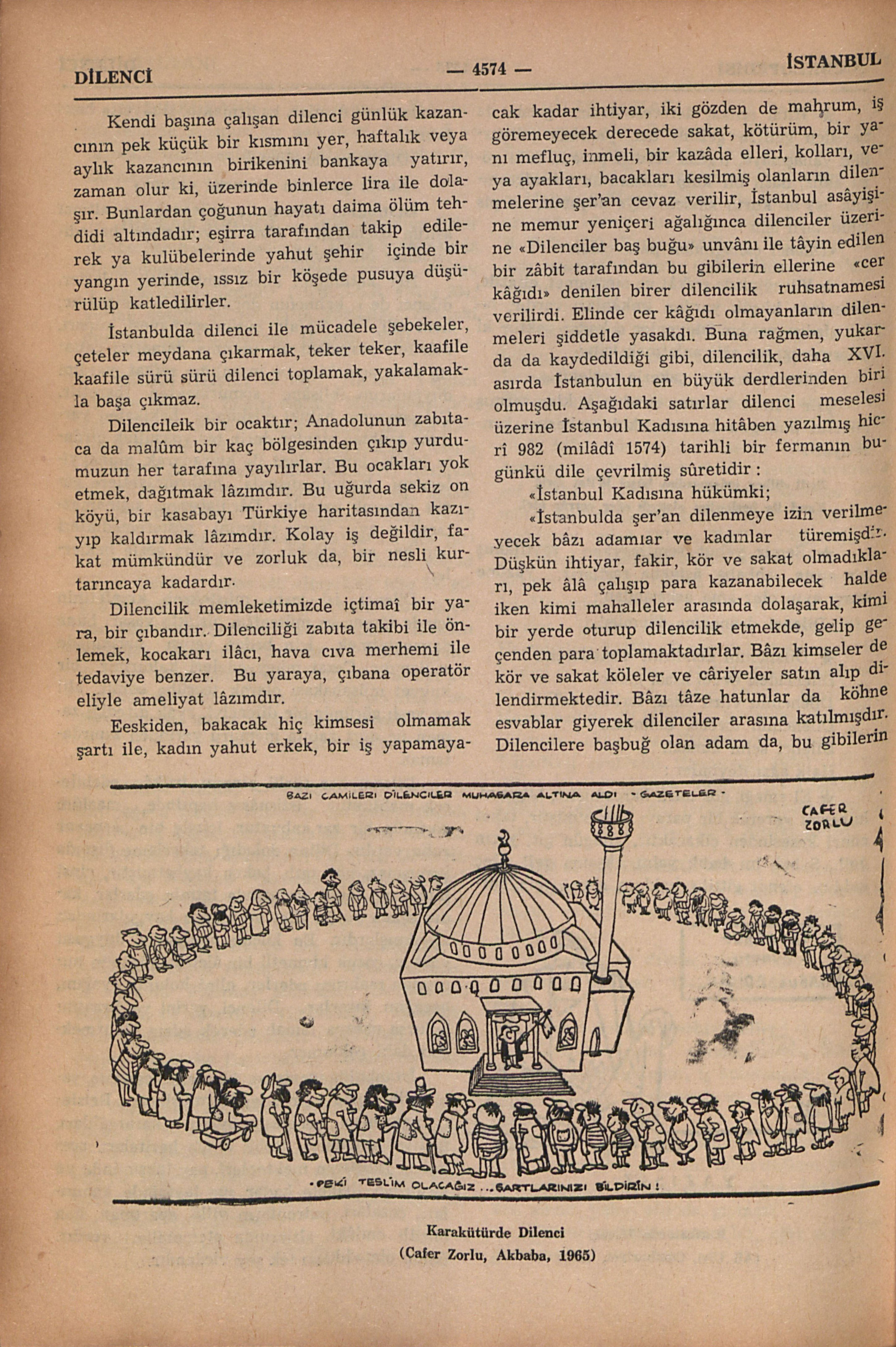 “İstanbul’da şer’an dilenmeye izin verilmeyecek bâzı adamlar ve kadınlar türemişdir. Düşkün ihtiyar, fakir, kör ve sakat olmadıkları, pek âlâ çalışıp para kazanabilecek halde iken kimi mahalleler arasında dolaşarak, kimi bir yerde oturup dilencilik etmekde, gelip geçenden para toplamaktadırlar. Bâzı kimseler de kör ve sakat köleler ve câriyeler satın alıp dilendirmektedir. Bâzı tâze hatunlar da köhne esvablar giyerek dilenciler arasına katılmıştır. Dilencilere başbuğ olan adam da, bu gibilerin parasını (rüşvetini) alarak ellerine cer kâğıdları vermişdir. Bu arada (para toplama yanında) edebden hariç işler olduğu da duyuldu.