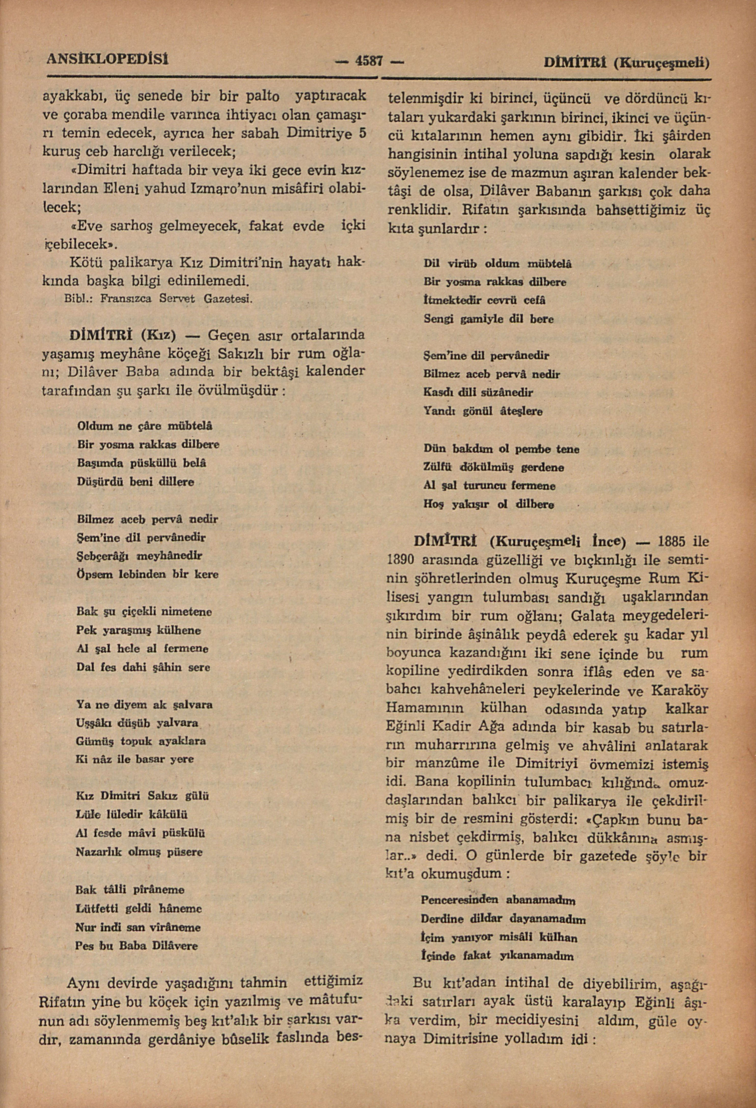 1885 ile 1890 arasında güzelliği ve bıçkınlığı ile semtinin şöhretlerinden olmuş Kuruçeşme Rum Kilisesi yangın tulumbası sandığı uşaklarından şıkırdım bir rum oğlanı; Galata meygedelerinin birinde âşinâlık peydâ ederek şu kadar yıl boyunca kazandığını iki sene içinde bu rum kopiline yedirdikten sonra iflâs eden ve sabahcı kahvehâneleri peykelerinde ve Karaköy Hamamının külhan odasında yatıp kalkar Eğinli Kadir Ağa adında bir kasab bu satırların muharrırına gelmiş ve ahvâlini anlatarak bir manzûme ile dimitriyi övmemizi istemiş idi. Bana kopilinin tulumbacı kılığında omuzdaşlarından balıkcı bir palikarya ile çekdirilmiş bir de resmini gösterdi: “Çapkın bunu bana nisbet çekdirmiş, balıkcı dükkânına asmışlar..” dedi. O günlerde bir gazetede şöyle bir kıt’a okumuşdum: