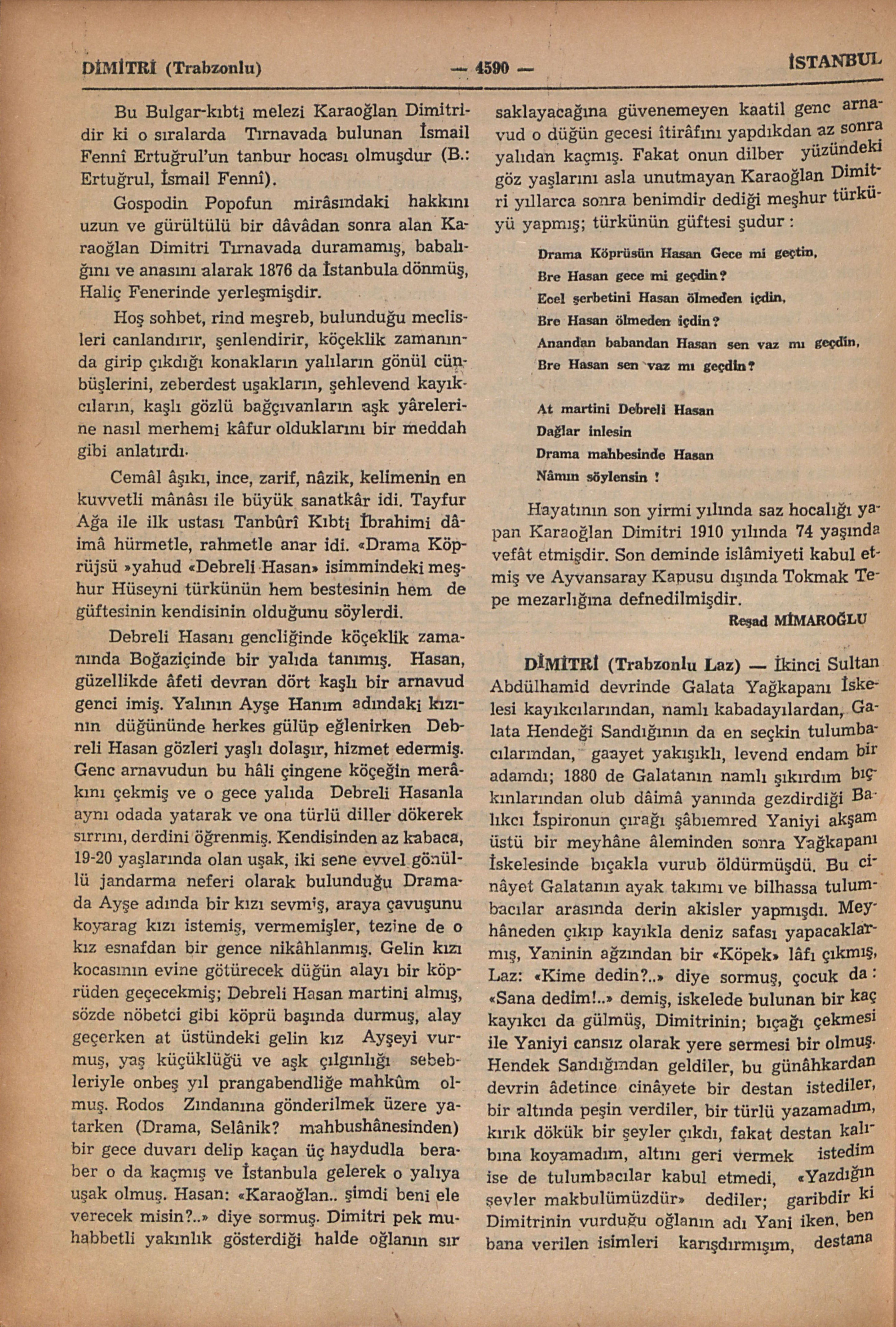 Tırnavanın hıristiyan çingenelerinden namlı bir köçek oğlan, sonra usta bir tanburî; kendi ifâdesine göre meşhur “Dırama Köprüsü” yahud “Debreli Hasan” türküsünün nâzmı ve bestegârı; 1836 da Tırnavada doğdu, 1851 de onbeş yaşında iken “Deli Binbaşı” diye anılan Arabkirli Tayfur Ağanın uşağı ve has köçeği olmuş, kendisine aşırı alâkası olan bu zât tarafından İstanbul’a getirilmiş, büyükşehirden de Arabkire gitmek üzere hazırlandıkları sırada inmiş oldukları bir handa Tayfur Ağanın âni ölümü üzerine hâmisiz kalan Dimitri, meyhâne sâzendelerinden ve Lonca çingenelerinden Tanbûrî İbrahimin eline düşmüş, kısa bir zaman içinde Karaoğlan lakabı ile İstanbul’un namlı köçeklerinden biri olmuşdur. Hem oyunlarındaki hüneri, hem de ırkına has çizgiler ve nakışlarla aşırı derecede güzelliği, kibarların rindâne meclislerine girmesine kolaylakla yol açmış, 1855 de ondokuz yaşında iken Zeyrekde pek mükellef bir konağı olan Hâbil Efendi Elbârûtî adında Suriyeli bir hıristiyan arab zenginine kapulmuşdır ve Elbârûtî’nin gaayetle mahremi şıkırdım delikanlısı olmuştur. Câzibeli çağı geçdiği zaman elinde bir hüneri bulunması gerektiği yolunda efendisinin irşâdına uyarak ve temin edilen imkânlardan faydalanarak tanbur öğrenmeye başlamış, gayreti ve fıtrî istidâdı ile bu satın da hakkiyle sâhibi olmuşdu...