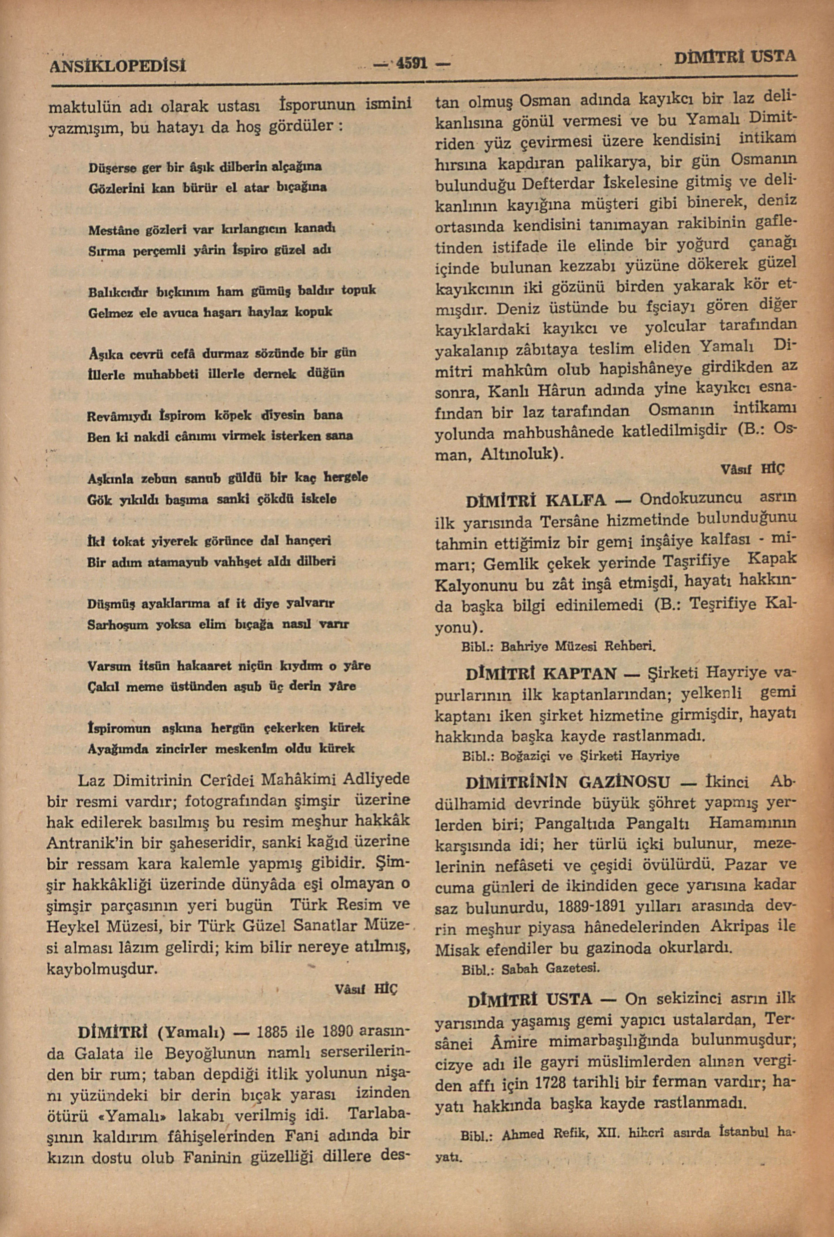 İkinsi Sultan Abdülhamid devrinde Galata Yağkapanı İskelesi kayıkcılarından, namlı kabadayılardan, Galata Hendeği Sandığının da en seçkin tulumbacılarından, gaayet yakışıklı, levend endam bir adamdı; 1880 de Galatanın namlı şıkırdım bıçkınlarından olub dâimâ yanında gezdirdiği Balıkcı İspironun çırağı şâbıemred Yaniyi akşam üstü bir meyhâne âleminden sonra Yağkapanı İskelesinde bıçakla vurub öldürmüşdü. Bu cinâyet Galatanın ayak takımı ve bilhassa tulumbacılar arasında derin akisler yapmışdı. Meyhâneden çıkıp kayıkla deniz safası yapacaklarmış, Yaninin ağzından bir “Köpek” lâfı çıkmış, Laz: “Kime dedin?..” diye sormuş, çocuk da: “Sana dedim!..” demiş, iskelede bulunan birkaç kayıkcı da gülmüş, Dimitrinin; bıçağı çekmesi ile Yaniyi cansız olarak ere sermesi bir olmuş. Hendek Sandığından geldiler, bu günâhkardan devrin âdetince cinâyete bir destan istediler, bir altında peşin verdiler, bir türlü yazamadım, kırık dökük bir şeyler çıktı, fakat destan alıbına koyamadım, altını geri vermek istedim ise de tulumbacılar kabul etmedi, “Yazdığın şeyler makbulümüzdür” dediler; garibdir ki Dimitrinin vurduğu oğlanın adı Yani iken ben bana verilen isimleri karıştırmışım, destana maktulün adı olarak ustası İsporunun ismini yazmışım, bu hayatı da hoş gördüler:
