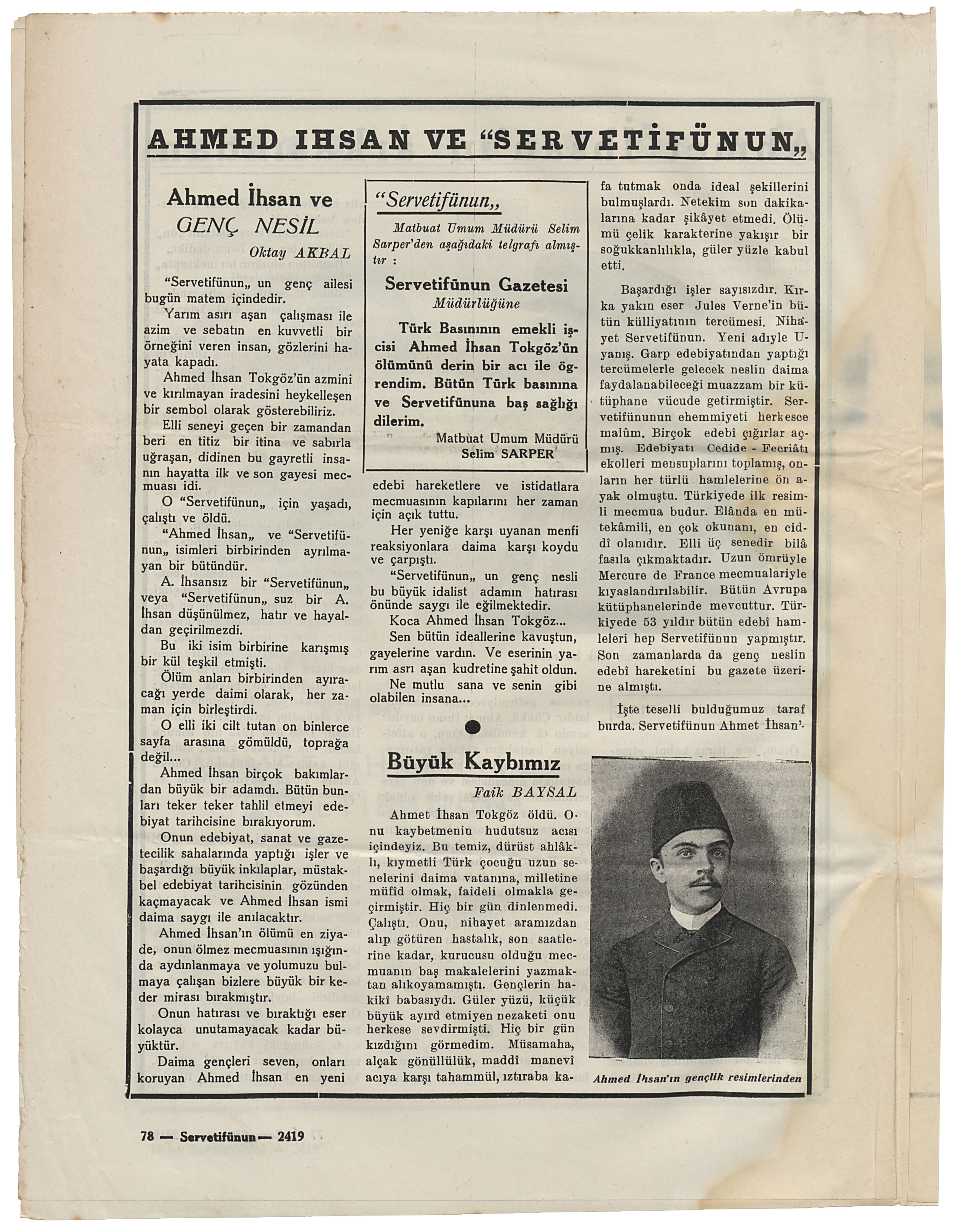Serveti Fünun Uyanış haftalık gazetesinin kurucusu Ahmet İhsan Tokgöz'ün ölümü sonrası yayınlanan 31 Birincikânun 1942 tarihli 2419. sayısı