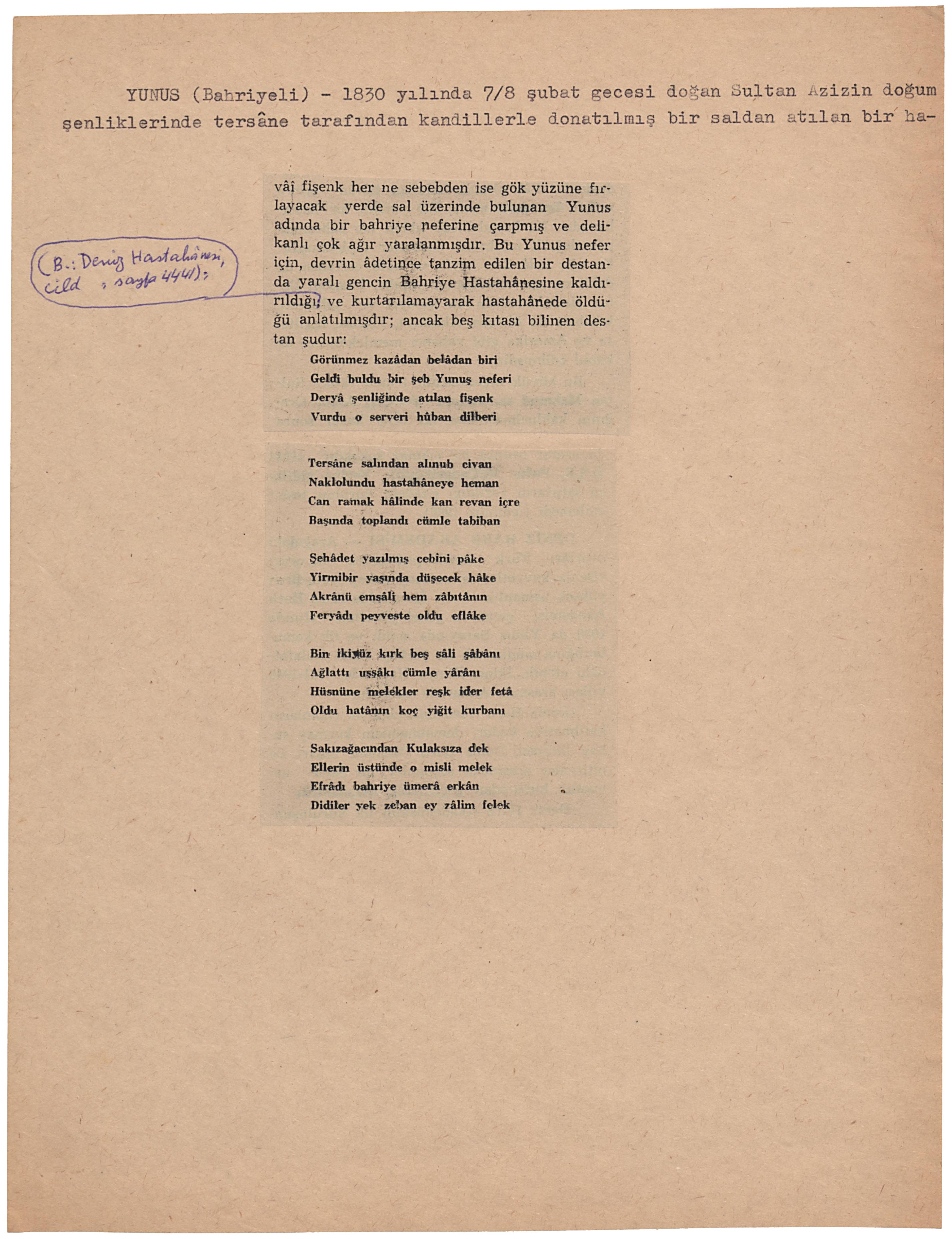 YUNUS (Bahriyeli) – 1830 yılında 7/8 şubat gecesi doğan Sultan Azizin doğum şenliklerinde tersâne tarafından kandillerle donatılmış bir saldan atılan bir havâi fişenk her ne sebebden ise gök yüzüne fırlayacak yerde sal üzerinde bulunan Yunus adında bir bahriye neferine çarpmış ve delikanlı çok ağır yaralanmışdır. Bu Yunus nefer için, devrin âdetince tanzim edilen bir destanda yaralı gencin Bahriye Hastahânesine kaldırıldığı (B.: Deniz Hastahânesi, cild , sayfa 4441), ve kurtarılamayarak hastahânede öldüğü anlatılmışdır; ancak beş kıtası bilinen destan şudur: