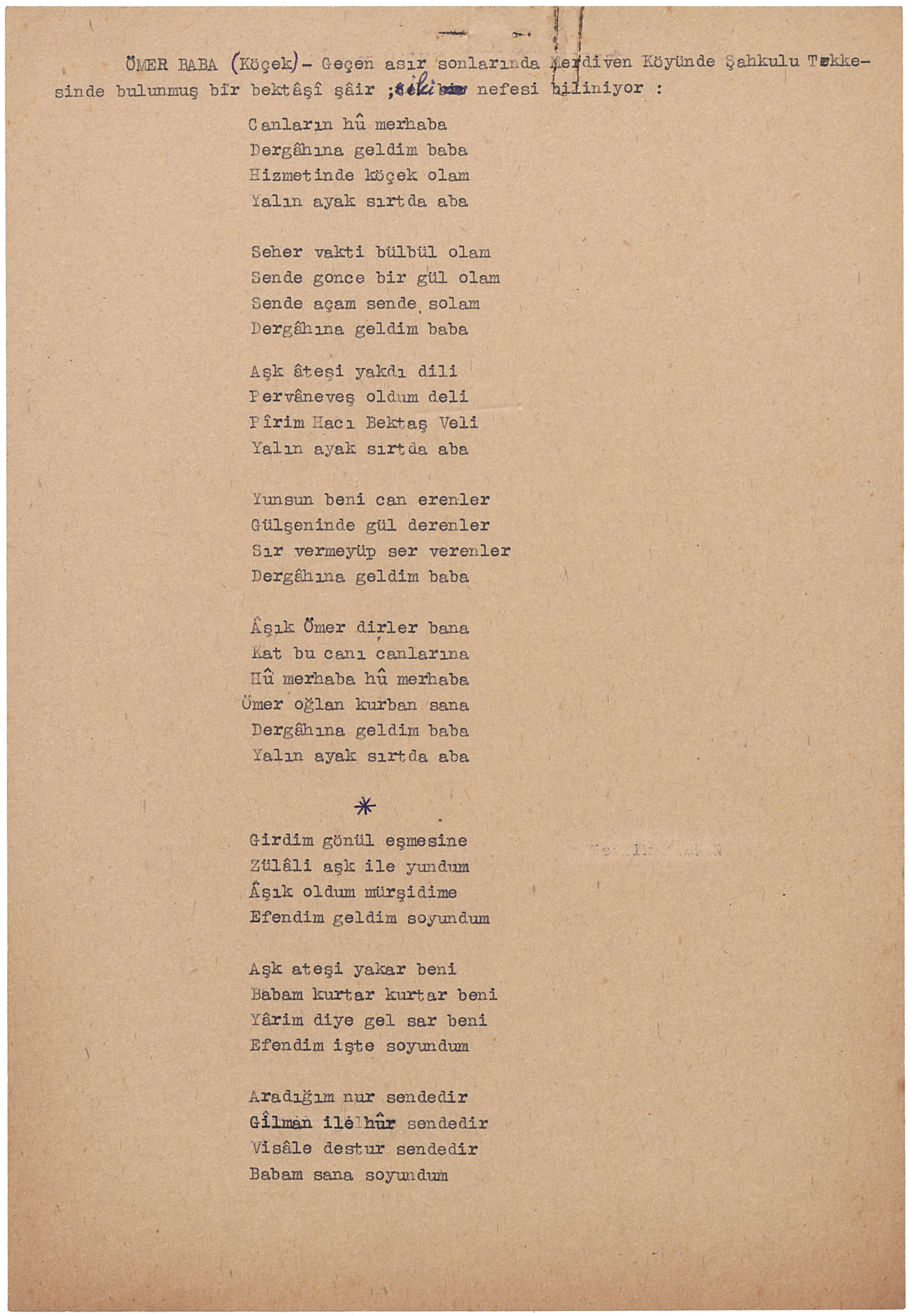 ÖMER BABA ( Köçek ) – Geçen asır sonlarında Merdiven Köyünde Şahkulu Tekkesinde bulunmuş bir bektâşî ; iki nefesi biliniyor :