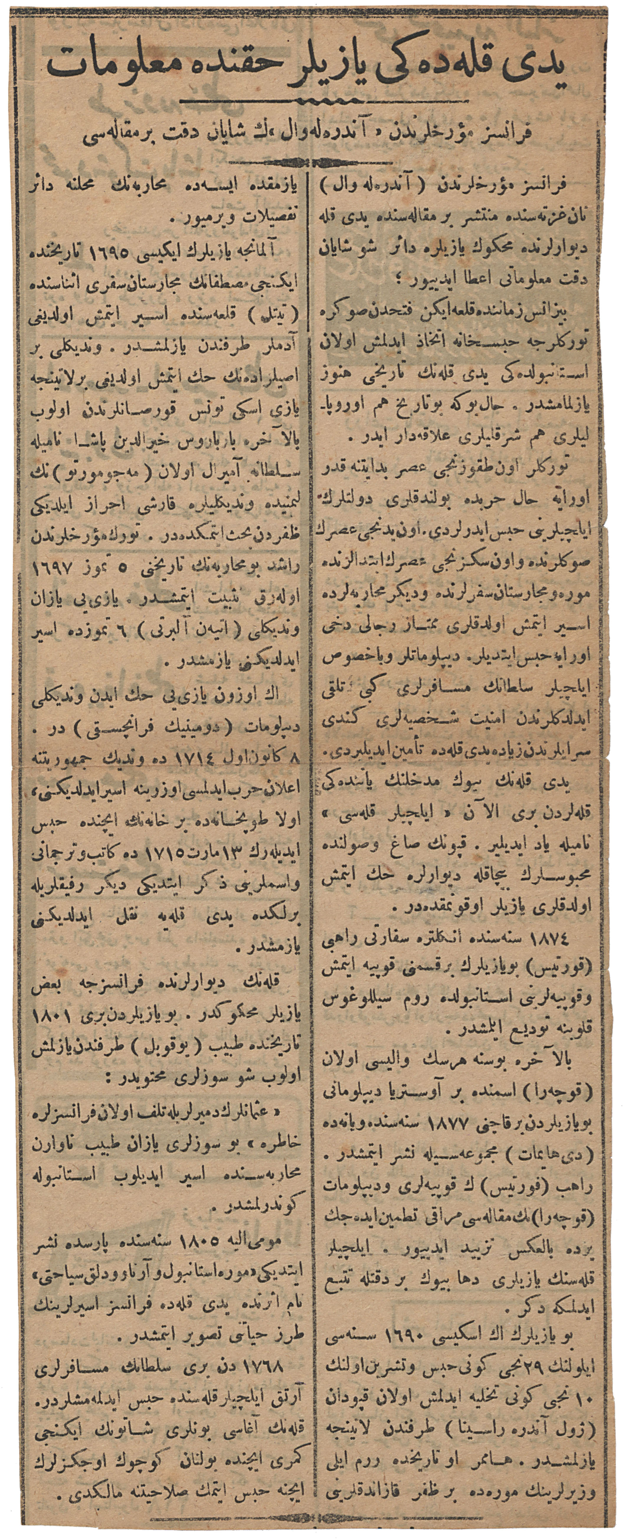 "Yedikuledeki yazılar hakkında ma'lûmât Fransız müverrihlerinden, 'Andre Leval'in şayân-ı dikkat bir makâlesi" başlıklı kupür