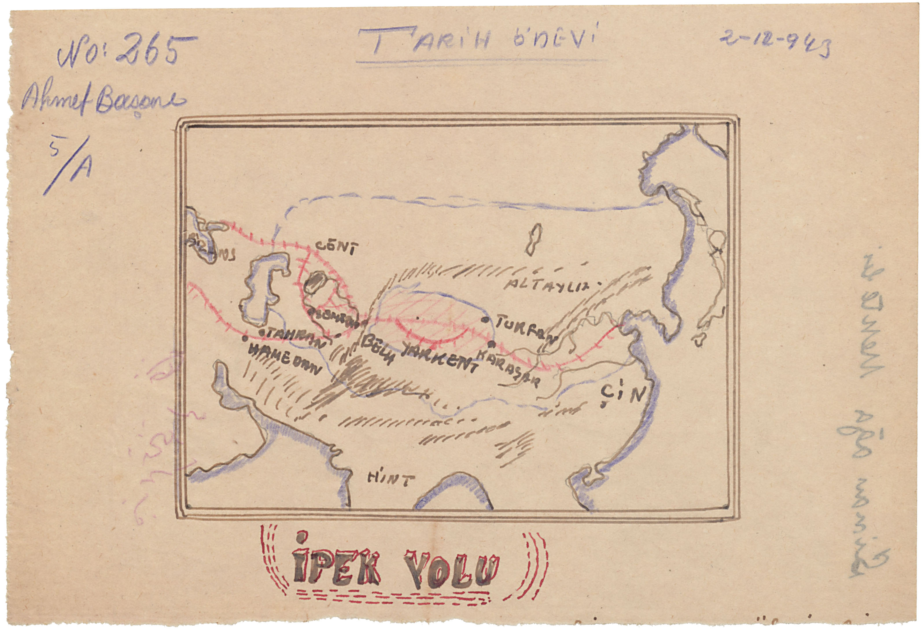 Ink and pen on paper. There is a hand drawn map of Silk Road drawn for history class homework with colored pencil by Ahmet Başaran with number 265 from 5/A class on the back of the document.