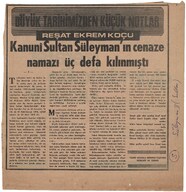 Süleyman II. Kanuni maddesine ilişkin kupürler, dergi sayfaları ve notlar