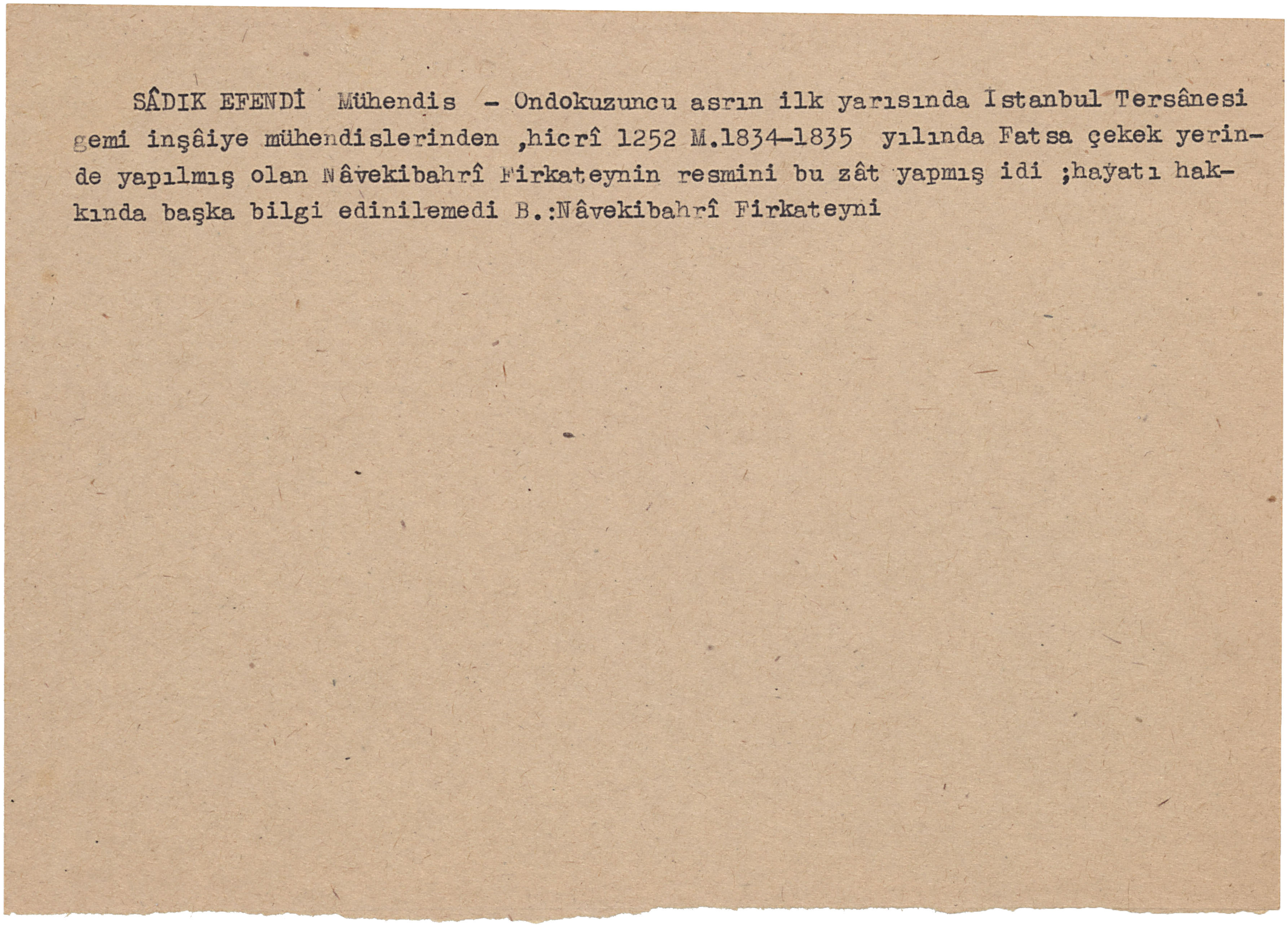 SÂDIK EFENDİ ( Mühendis ) - Ondokuzuncu asrın ilk yarısında İstanbul Tersnesi gemi inşâiye mühendislerinden ,hicrî 1252 M.1834-1835 yılında Fatsa çekek yerinde yapılmış olan Nâvekibahrî Firkateynin resmini bu zât yapmış idi ;hayatı hakkında başka bilgi edinilemedi B.:Nâvekibahrî Firkateyni