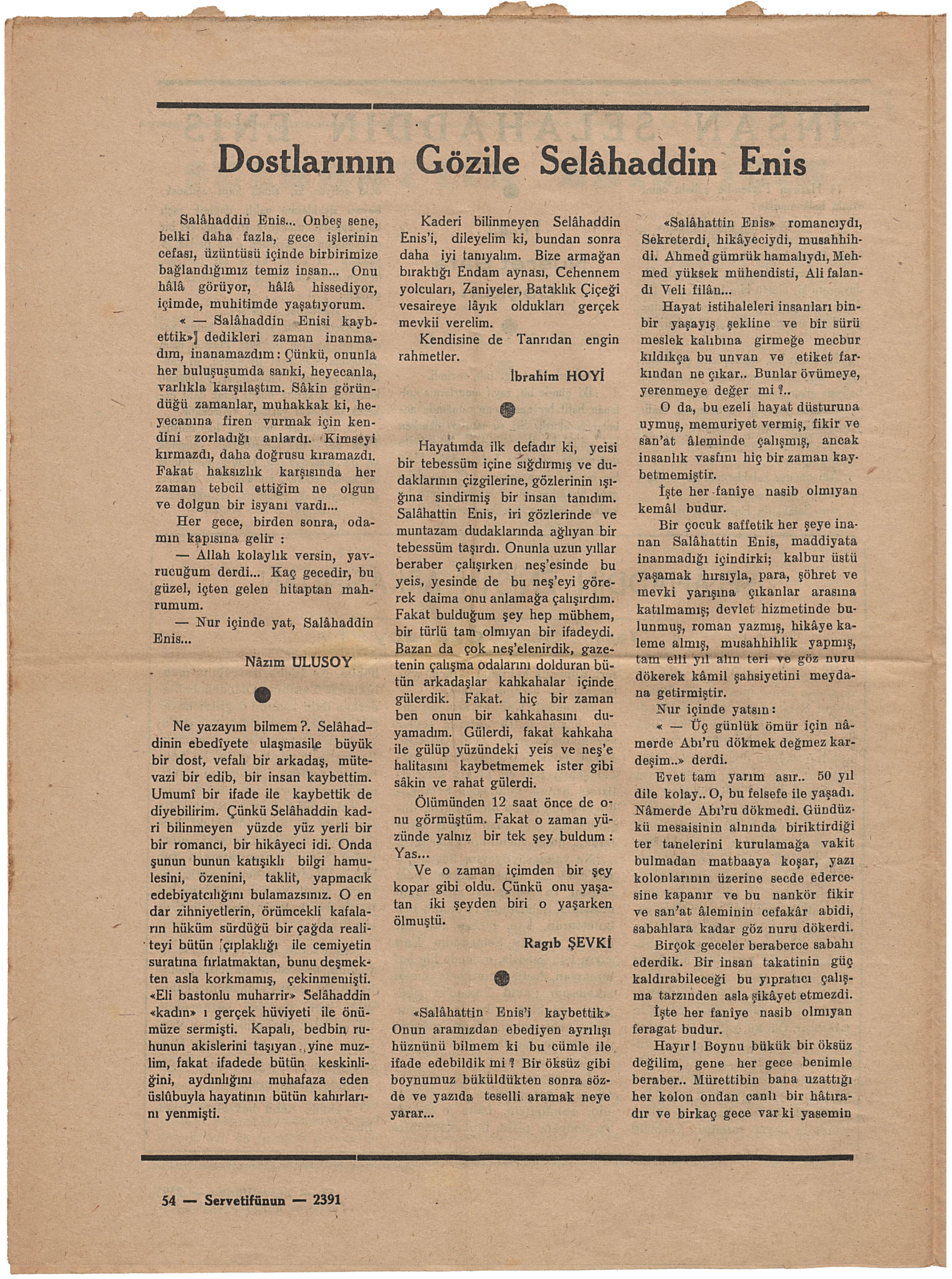 "Dostlarının Gözile Selâhaddin Enis" başlıklı dergi sayfası
