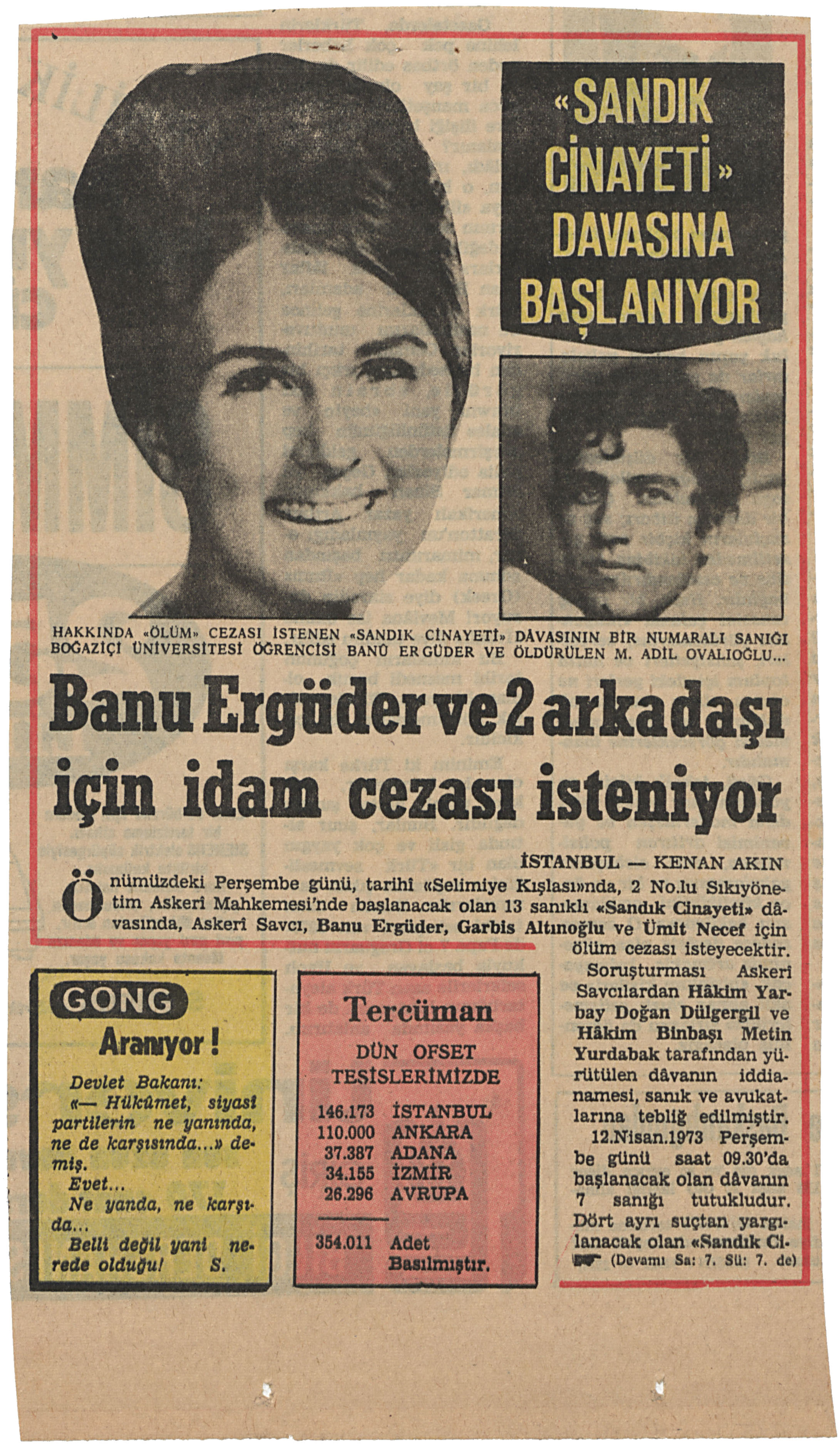 "'Sandık Cinayeti' Davasına Başlanıyor. Banu Ergüder ve 2 arkadaşı için idam cezası isteniyor" başlıklı kupür