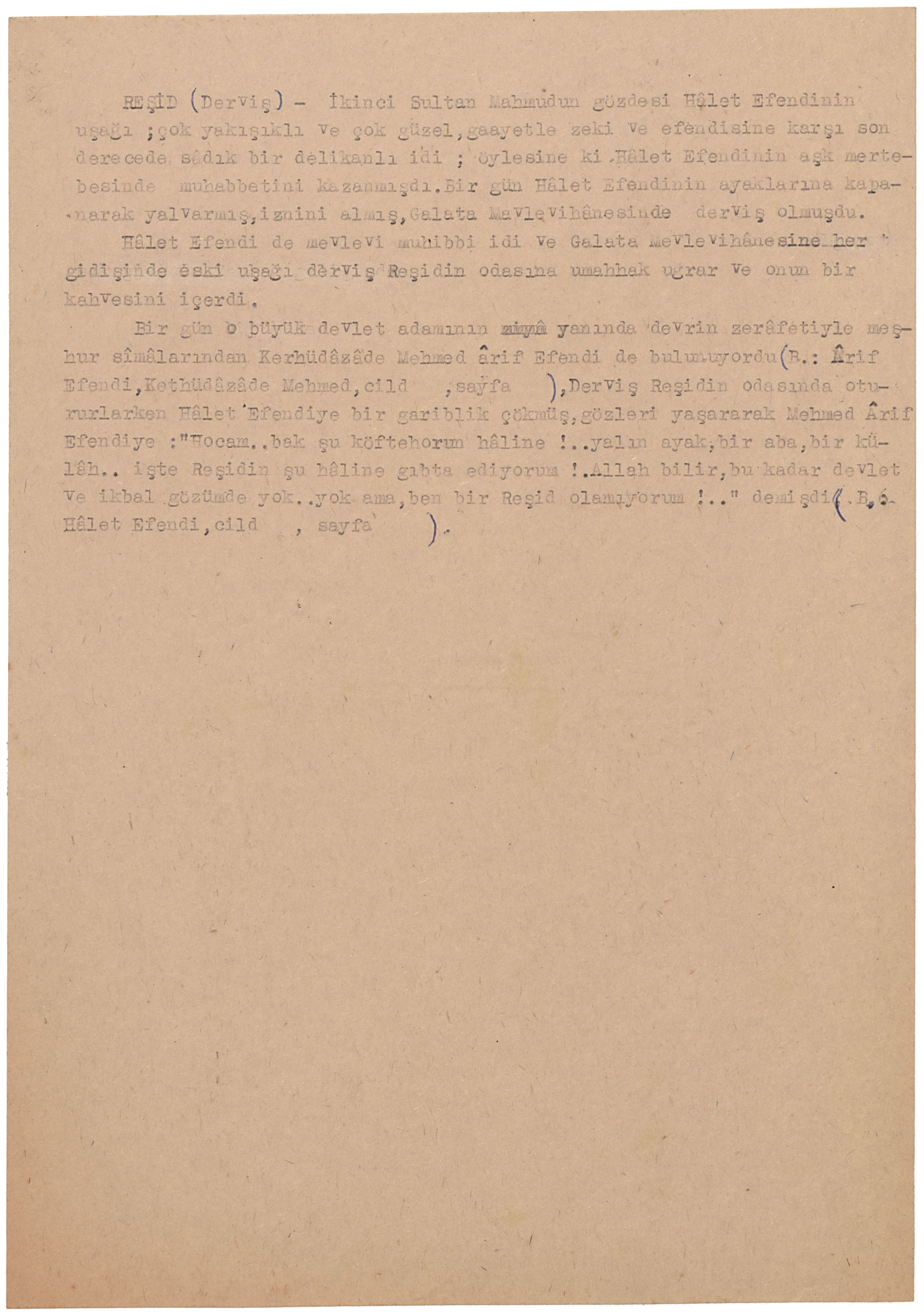REŞİD (Derviş) – İkinci Sultan Mahmudun gözdesi Hâlet Efendinin uşağı ;çok yakışıklı ve çok güzel,gaayetle zeki ve efendisine karşı son derecede sâdık bir delikanlı idi ; öylesine ki Hâlet Efendinin aşk mertebesinde muhabbetini kazanmışdı.Bir gün Hâlet Efendinin ayaklarına kapanarak yalvarmış,iznini almış,Galata Mevlevihânesinde derviş olmuşdu.