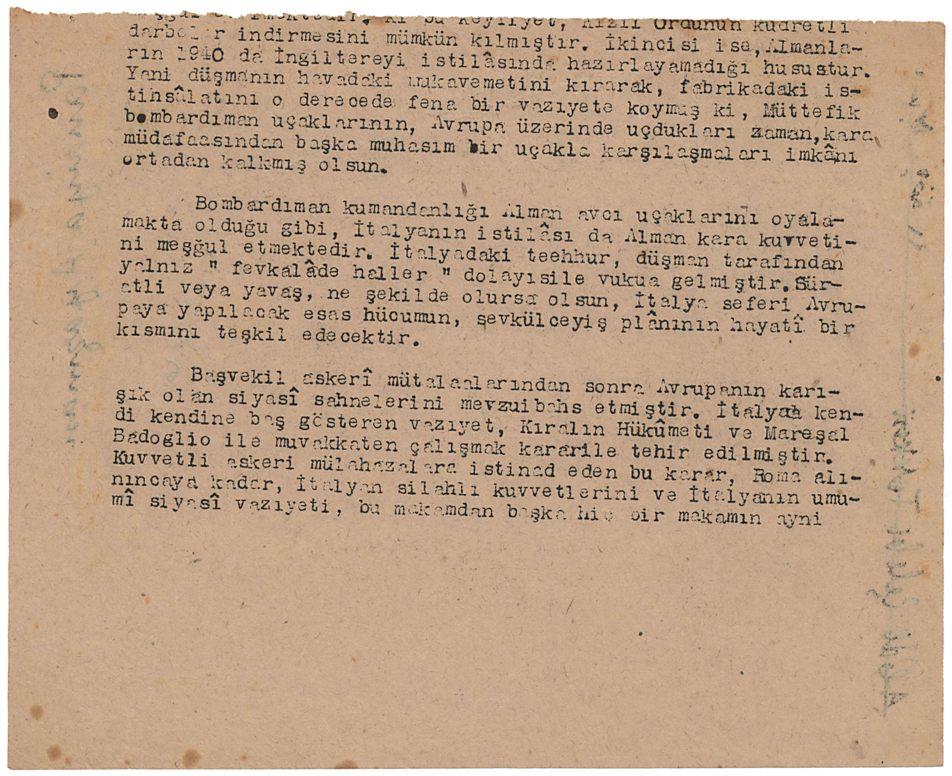 Kâğıt üzerine mürekkep. Mürekkeple daha önce yazılmış madde başlığı karalanmıştır. Belgenin arka yüzünde daktiloyla yazılmış metin parçası vardır.