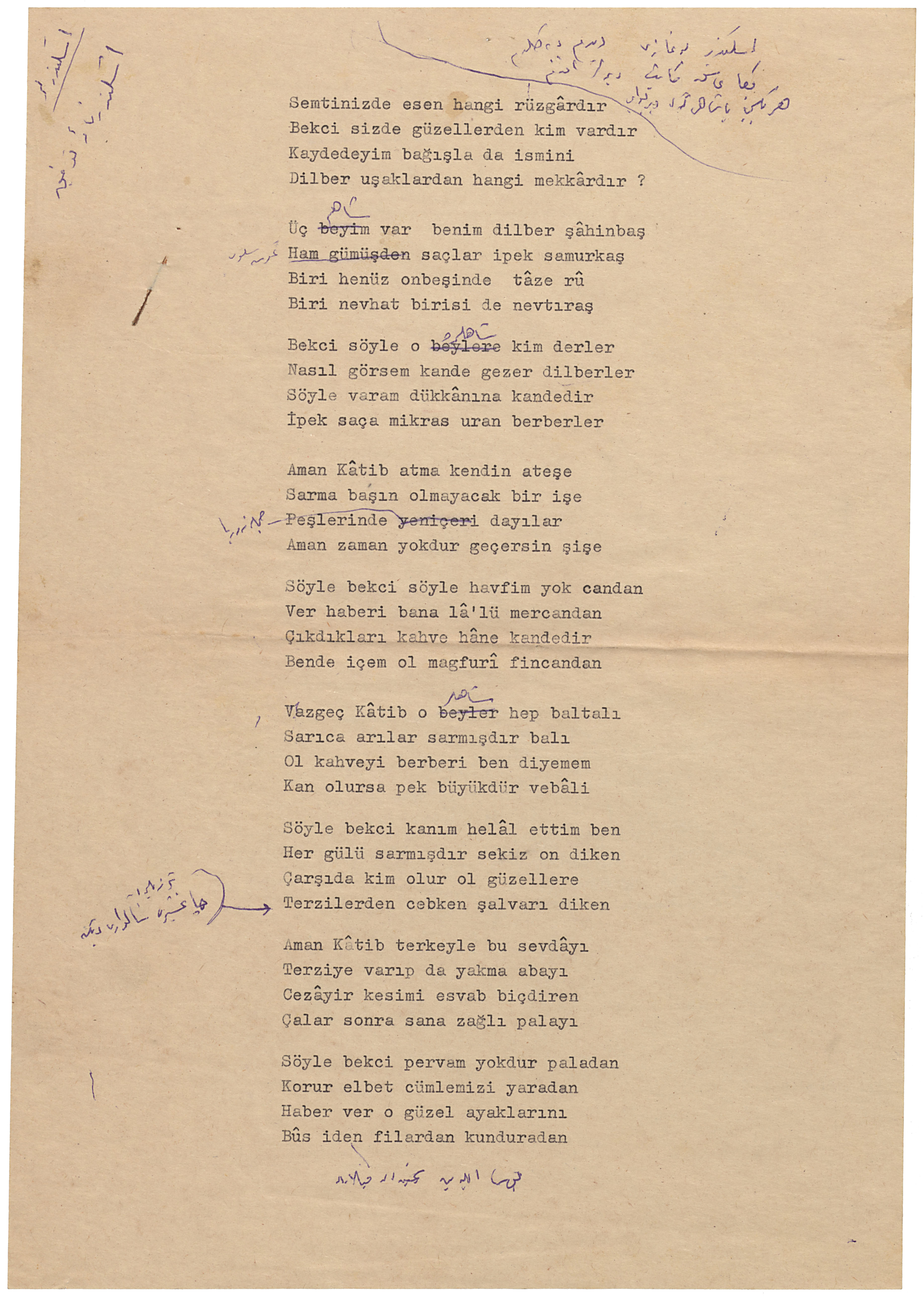 Kâğıt üzerine daktilo ve tükenmez kalem. Düzeltme ve notlar tükenmez kalemle yazılmıştır.