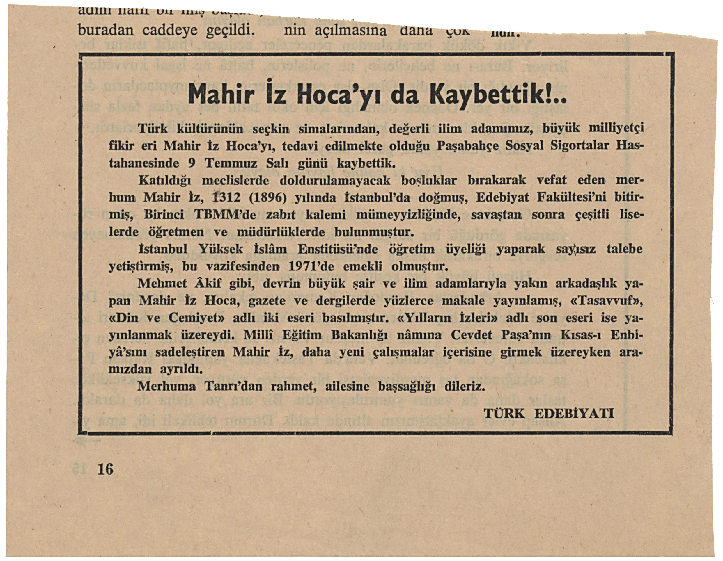 İz (Mahir), Mahir İz, Paşabahçe Sosyal Sigortalar Hastanesi, Paşabahçe Hospital of Social Insurances, Darülfünûn, Edebiyat Fakültesi, Faculty of Letters, Faculty of Literature, Zabıt kalemi mümeyyizi, Birinci Büyük Millet Meclisi, First Turkish Grand Assembly, Öğretmen, Teacher, Mehmet Akif Ersoy, Yüksek İslam Enstitüsü, Higher Instute of Islam, Kısas-ı Enbiya (Cevdet Paşa), Yılların İzleri (Mahir İz), Tasavvuf (Mahir İz), Din ve Cemiyet (Mahir İz), Eğitim, Education, Ölüm ilanları, Obituaries