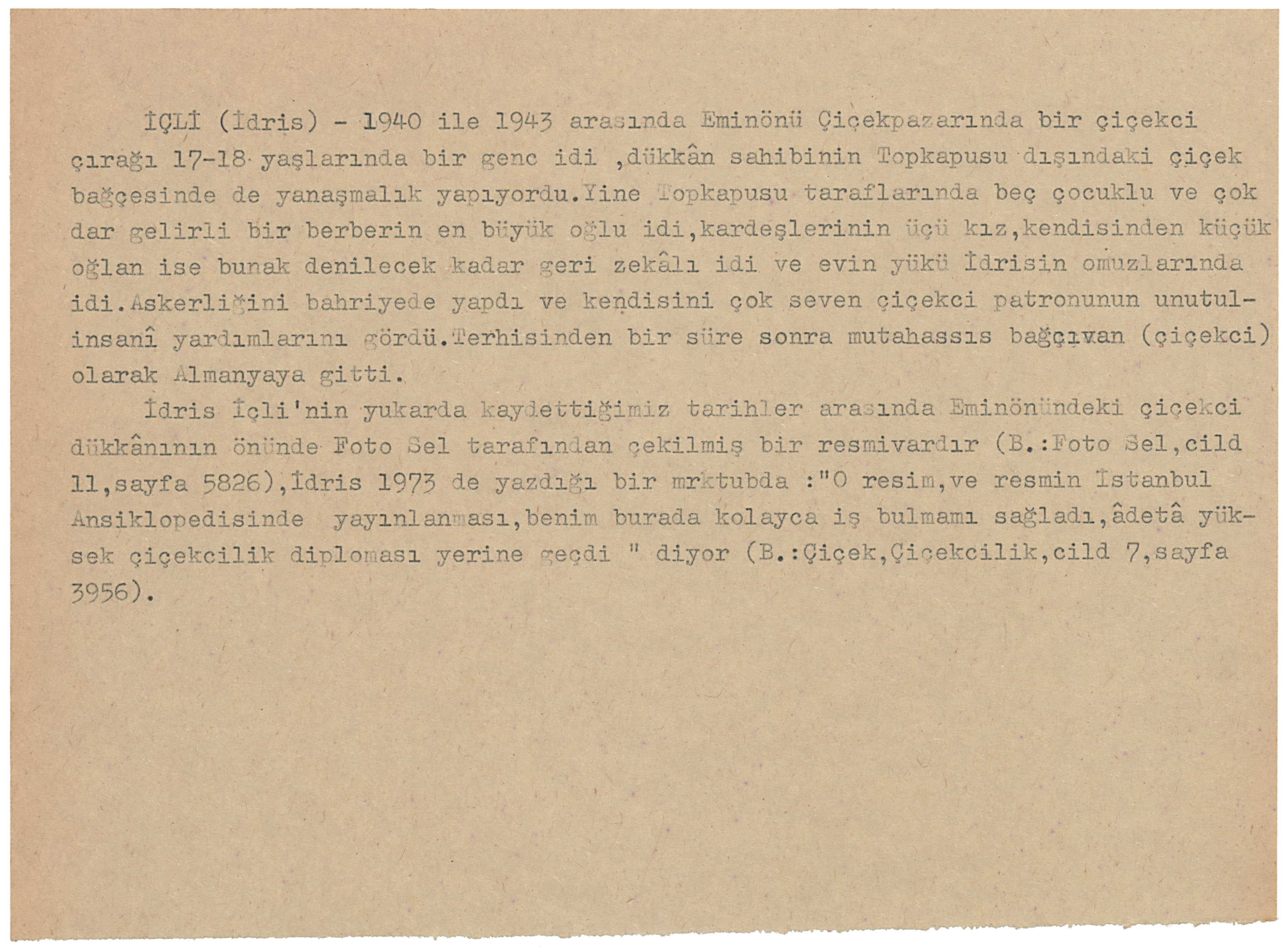 İdris İçli'nin yukarda kaydettiğimiz tarihler arasında Eminönündeki çiçekci dükkânının önünde Foto Sel tarafından çekilmiş bir resmivardır (B.:Foto Sel,cild 11,sayfa 5826),İdris 1973 de yazdığı bir mrktubda :“O resim,ve resmin İstanbul Ansiklopedisinde yayınlanması,benim burada kolayca iş bulmamı sağladı,âdetâ yüksek çiçekcilik diploması yerine geçdi ” diyor (B.:Çiçek,Çiçekcilik,cild 7,sayfa 3956).