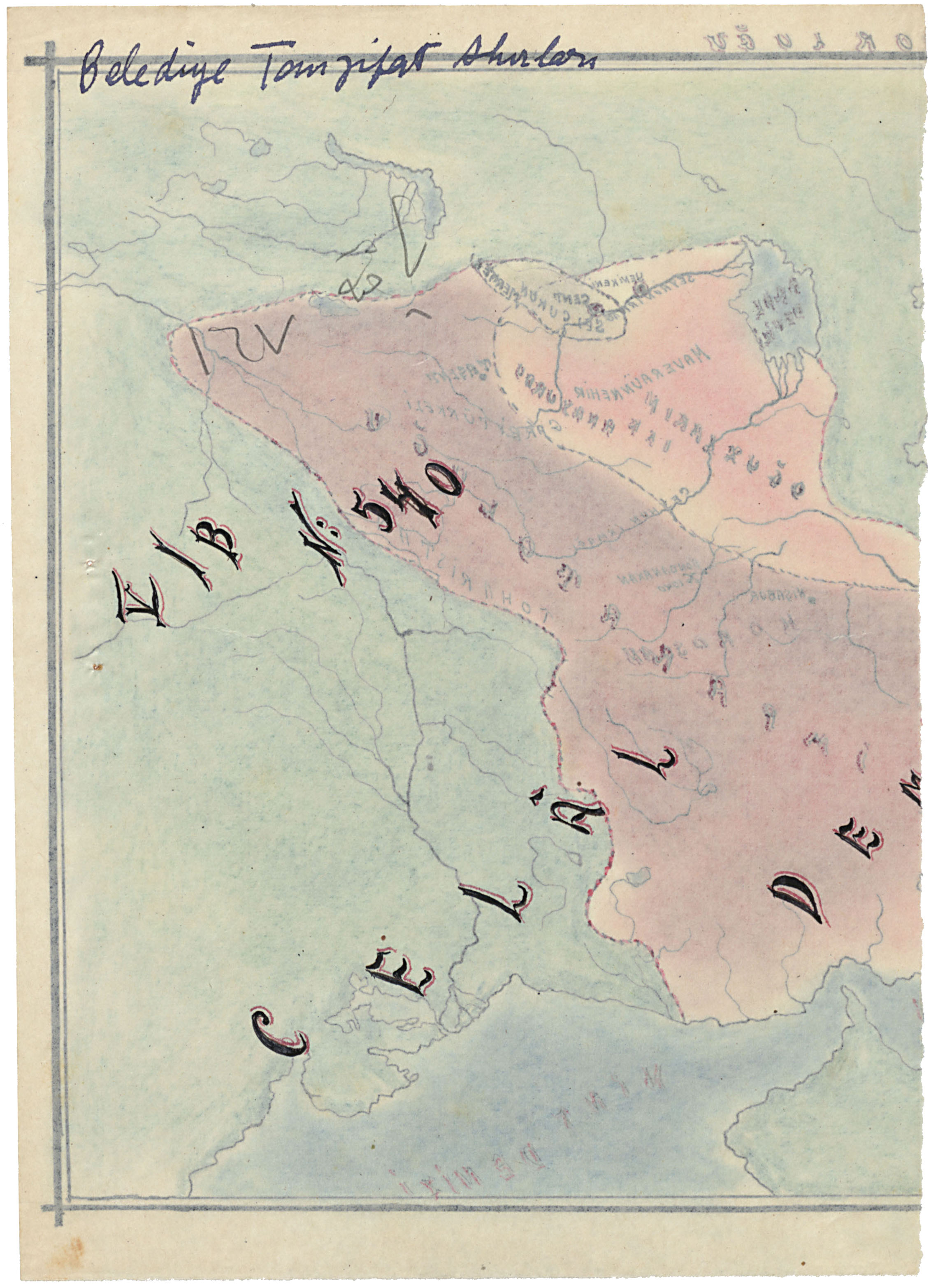Kâğıt üzerine mürekkep ve kurşun kalem. Not ödev kâğıdı üzerine yazılmıştır. Belgenin arkasında kurşun kalemle çizilmiş harita ve ödev parçası vardır.