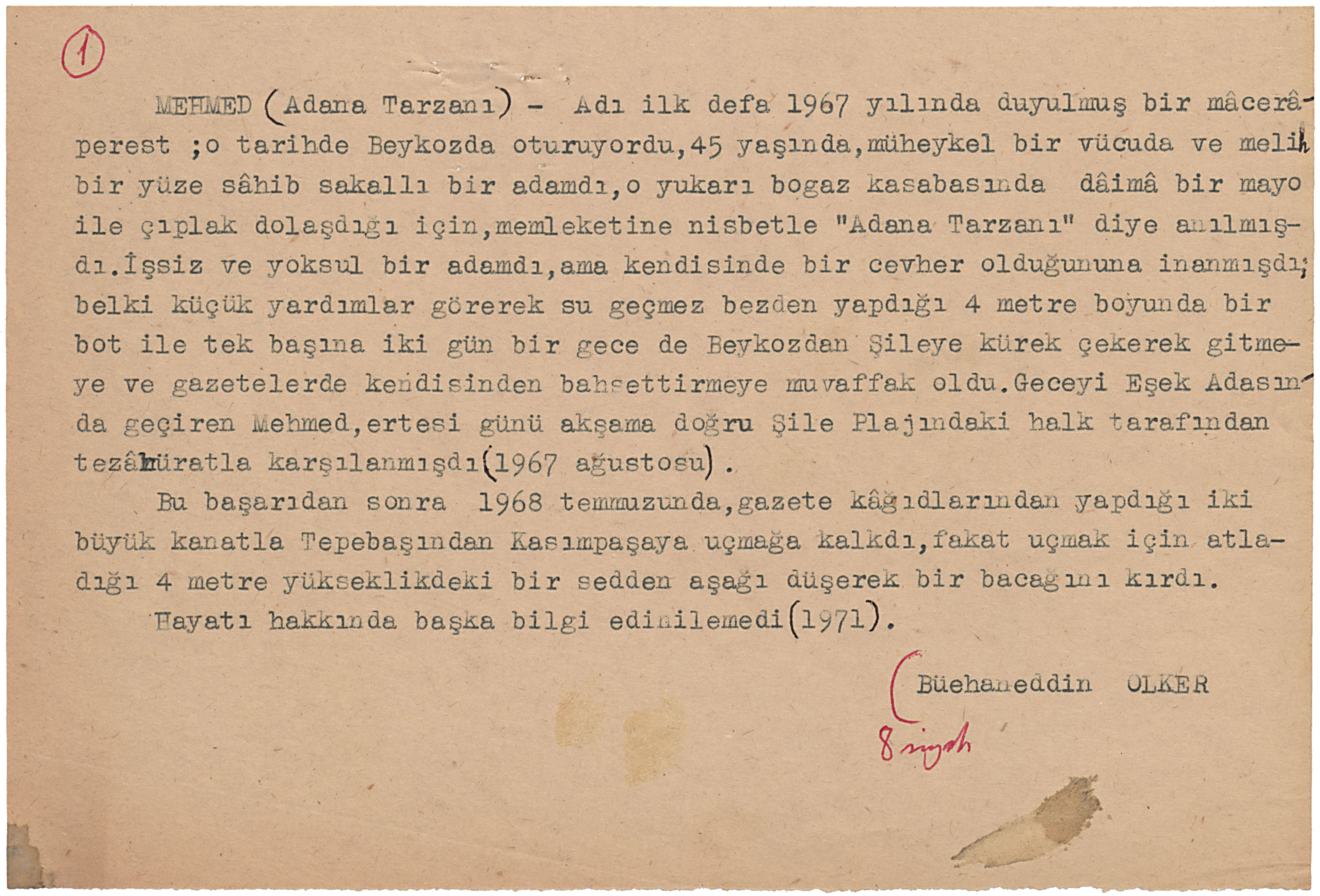 MEHMED ( Adana Tarzanı ) – Adı ilk defa 1967 yılında duyulmuş bir mâcerâperest ;o tarihde Beykozda oturuyordu,45 yaşında,müheykel bir vücuda ve melih bir yüze sâhib sakallı bir adamdı,o yukarı bogaz kasabasında dâimâ bir mayo ile çıplak dolaşdığı için,memleketine nisbetle “Adana Tarzanı” diye anılmışdı.İşsiz ve yoksul bir adamdı,ama kendisinde bir cevher olduğununa inanmışdı; belki küçük yardımlar görerek su geçmez bezden yapdığı 4 metre boyunda bir bot ile tek başına iki gün bir gece de Beykozdan Şileye kürek çekerek gitmeye ve gazetelerde kendisinden bahsettirmeye muvaffak oldu.Geceyi Eşek Adasında geçiren Mehmed,ertesi günü akşama doğru Şile Plajındaki halk tarafından tezâhüratla karşılanmışdı (1967 ağustosu) .