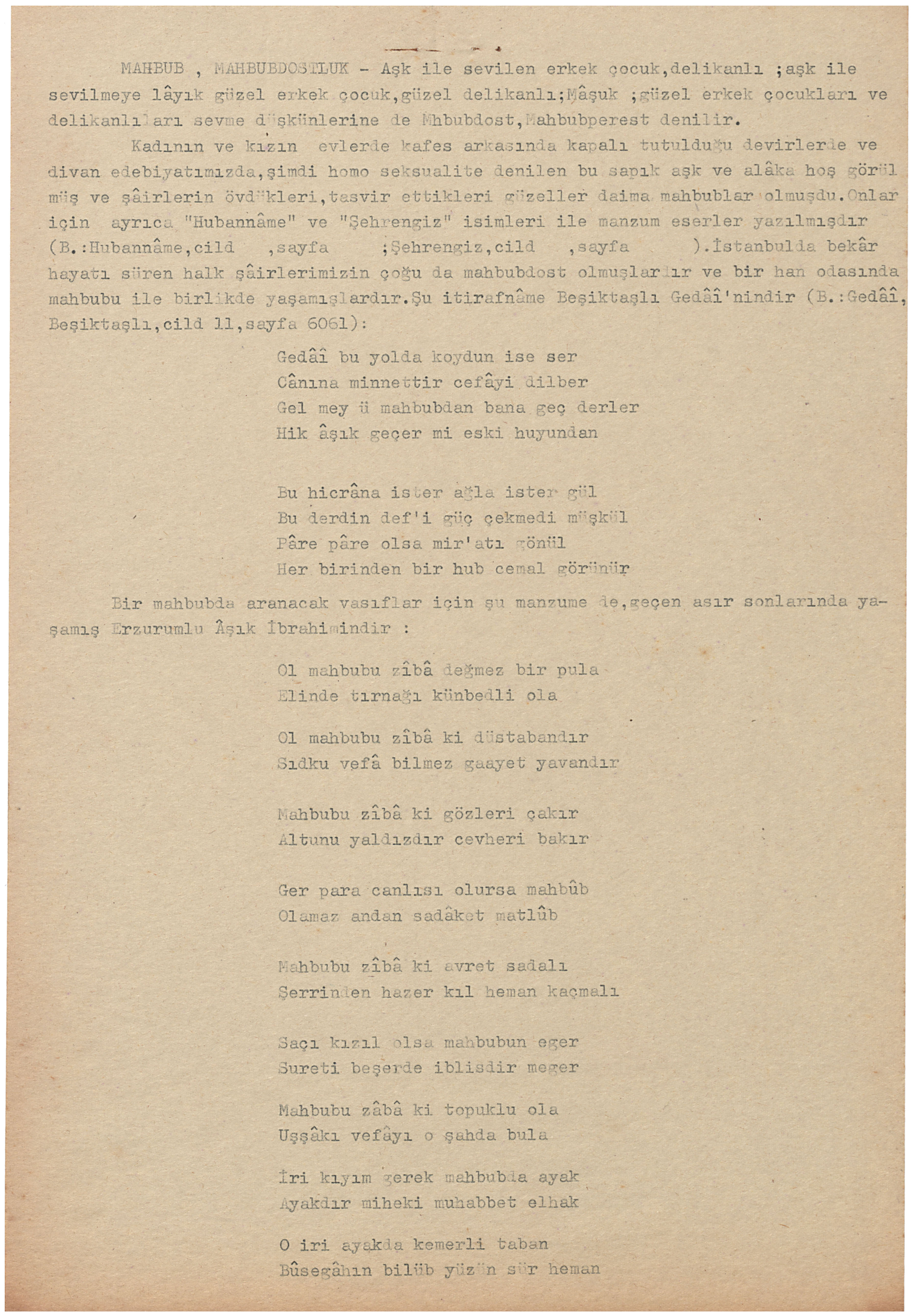 Kadının ve kızın evlerle kafes arkasında kapalı tutulduğu devirlerde ve divan edebiyatımızda,şimdi homo seksualite denilen bu sapık aşk ve alâka hoş görülmüş ve şâirlerin övdükleri,tasvir ettikleri güzeller daima mahbublar olmşudu.Onlar için ayrıca “Hubannâme” ve “Şehrengiz” isimleri ile manzum eserler yazılmışdır (B.:Hubannâme,cild ,sayfa ;Şehrengiz,cild ,sayfa ).İstanbulda bekâr hayatı süren halk şâirlerimizin çoğu da mahbubdost olmuşlardır ve bir han odasında mahbubu ile birlikde yaşamışlardır.Şu itirafnâme Beşiktaşlı Gedâî’nindir (B.:Gedâî,Beşiktaşlı,cild 11,sayfa 6061):