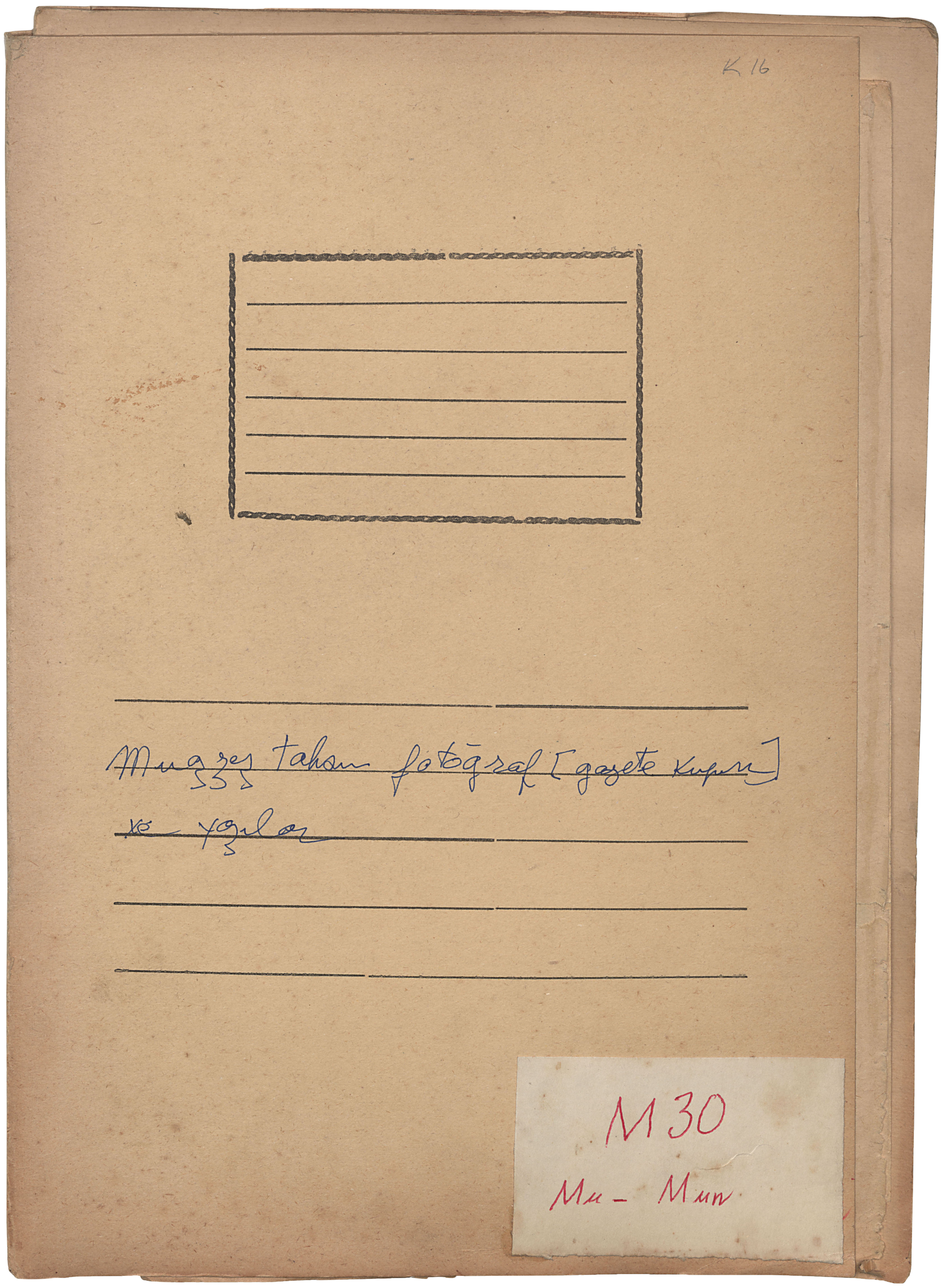 Pen on carton and label. Note of "Muazzez Tahsin photograph [clipping] and texts" is written with pen on the carton.