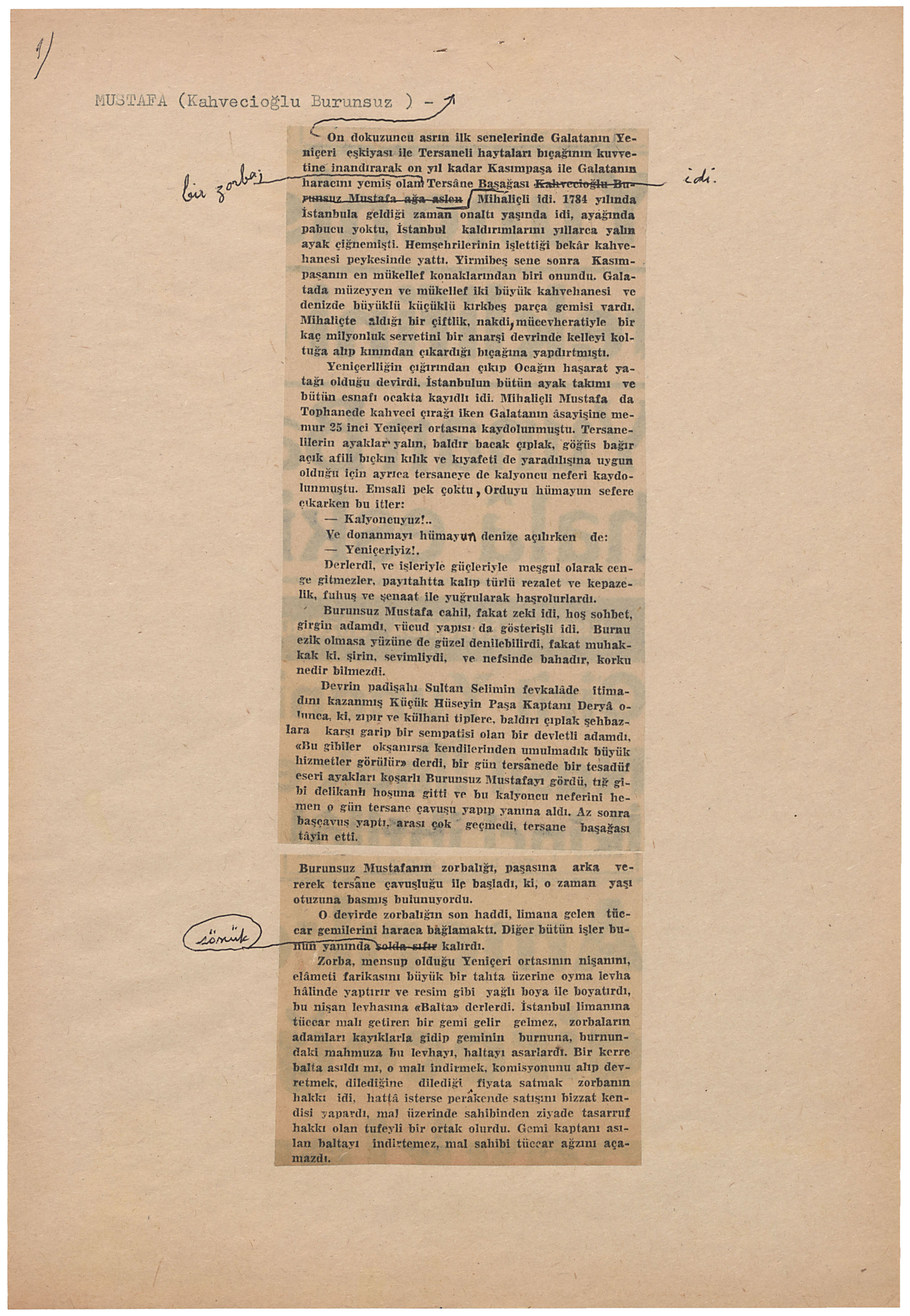 MUSTAFA (Kahvecioğlu Burunsuz ) - On dokuzuncu asrın ilk senelerinde Galatanın Yeniçeri eşkiyası ile Tersaneli haytaları bıçağının kuvvetine inandırarak on yıl kadar Kasımpaşa ile Galatanın haracını yemiş olan bir zorba; Tersâne Başağası idi.