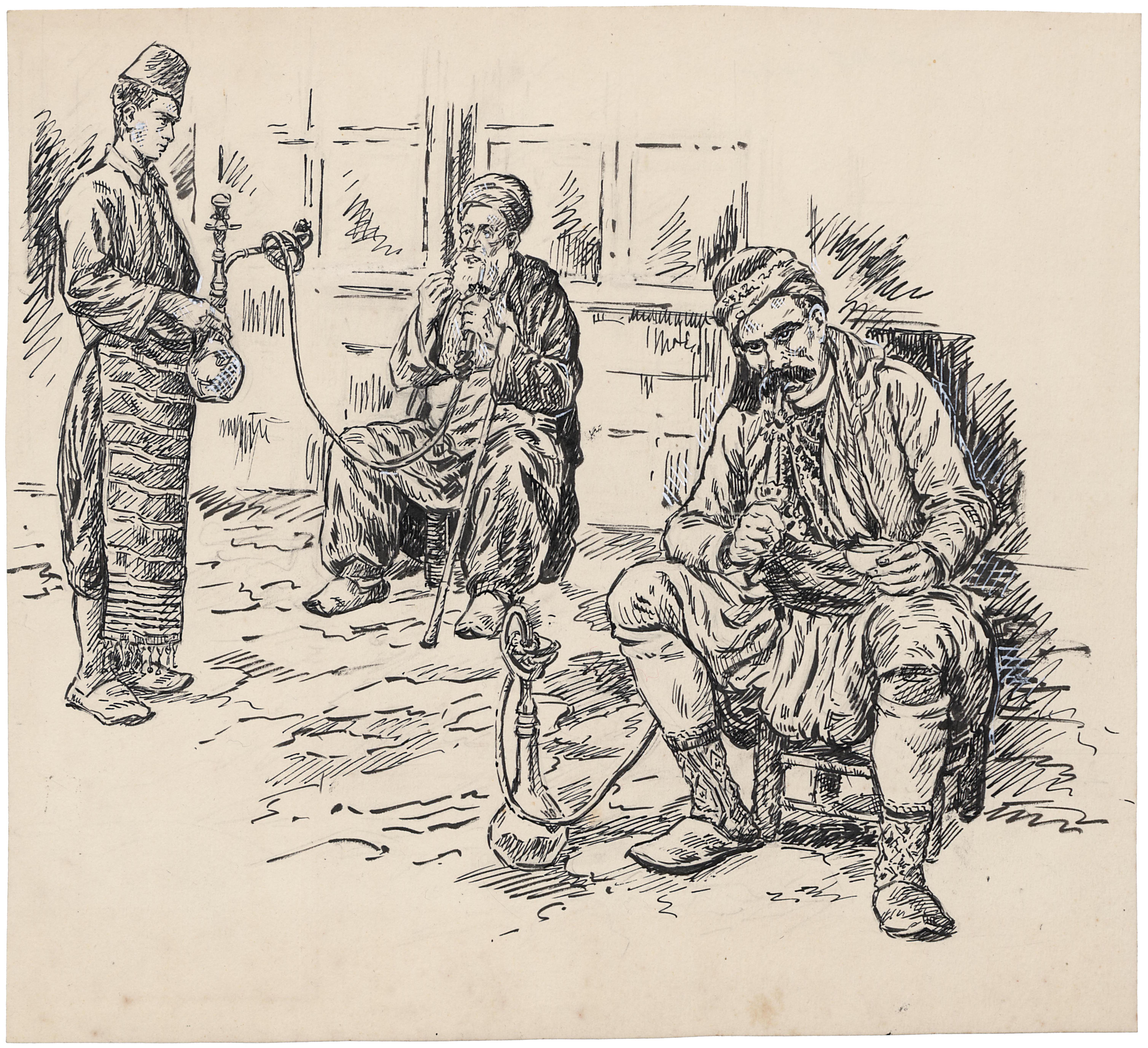 Redrawn drawing of Pascal Sebah's photograph "Turkish Coffee House"