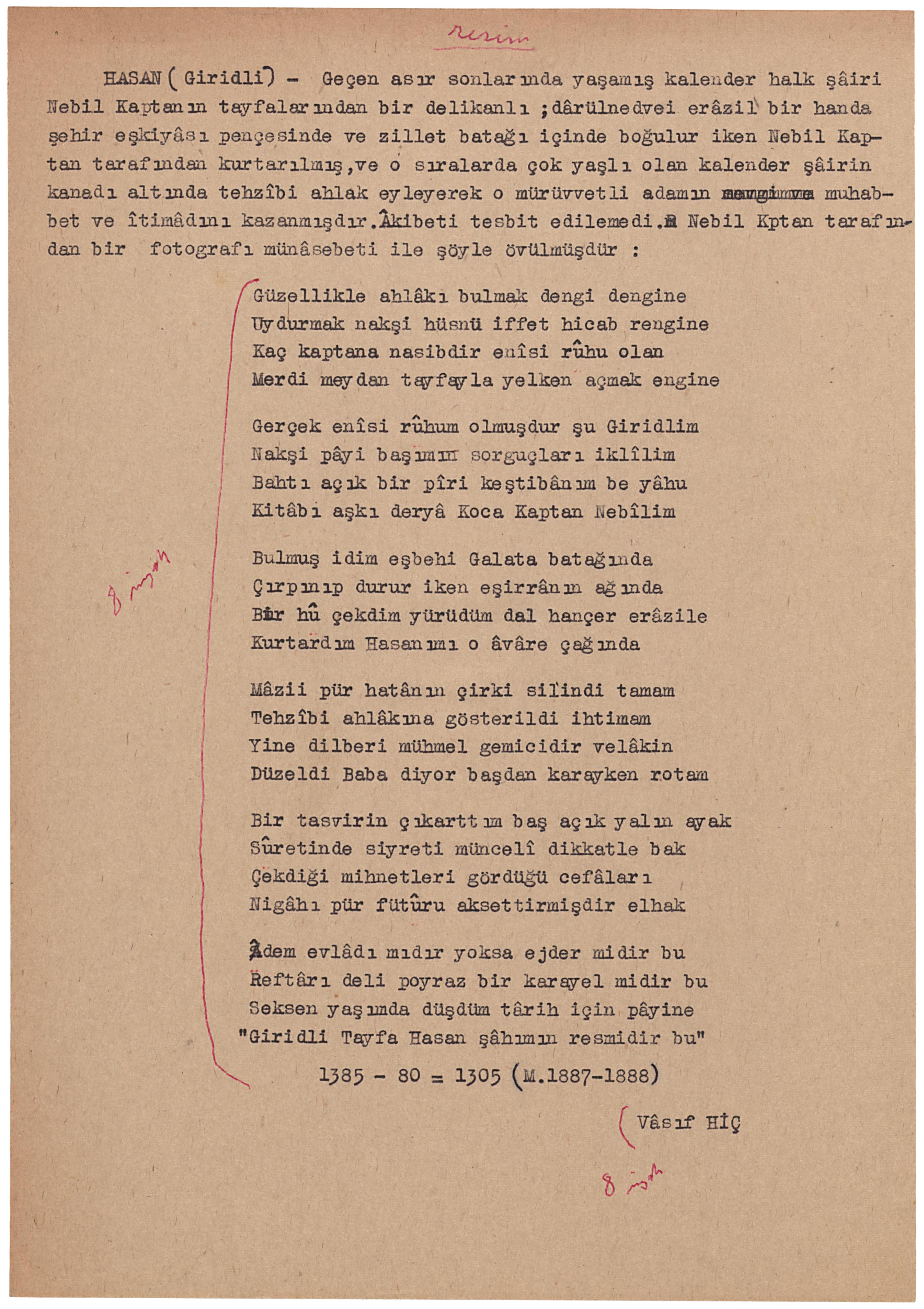 HASAN ( Giridli ) – Geçen asır sonlarında yaşamış kalender halk şâiri Nebil Kaptanın tayfalarından bir delikanlı ;dârülnedvei erâzil bir handa şehir eşkiyâsı pençesinde ve zillet batağı içinde boğulur iken Nebil Kaptan tarafından kurtarılmış,ve o sıralarda çok yaşlı olan kalender şâirin kanadı altında tehzîbi ahlak eyleyerek o mürüvvetli adamın rengi ve muhabbet ve îtimâdını kazanmışdır.Âkibeti tesbit edilemedi. Nebil Kaptan tarafından bir fotografı münâsebeti ile şöyle övülmüşdür :