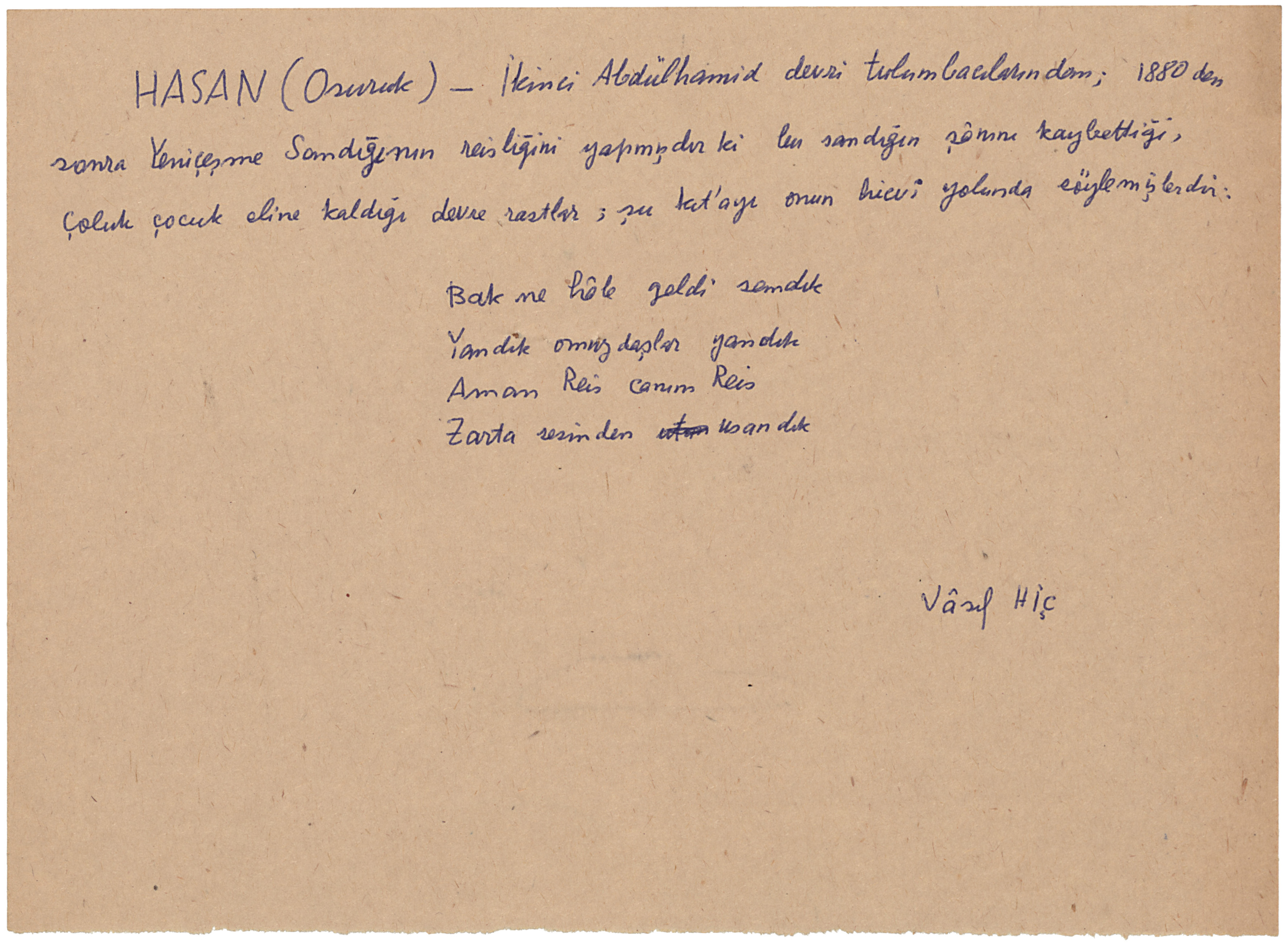HASAN ( Osuruk ) – İkinci Abdülhamid devri tulumbacılarından; 1880 den sonra Yeniçeşme Sandığının reisliğini yapmışdır ki bu sandığın şânını kaybettiği, çoluk çocuk eline kaldı devre rastlar ; şu kıt'ayı onun hicvi yolunda söylemişlerdir :