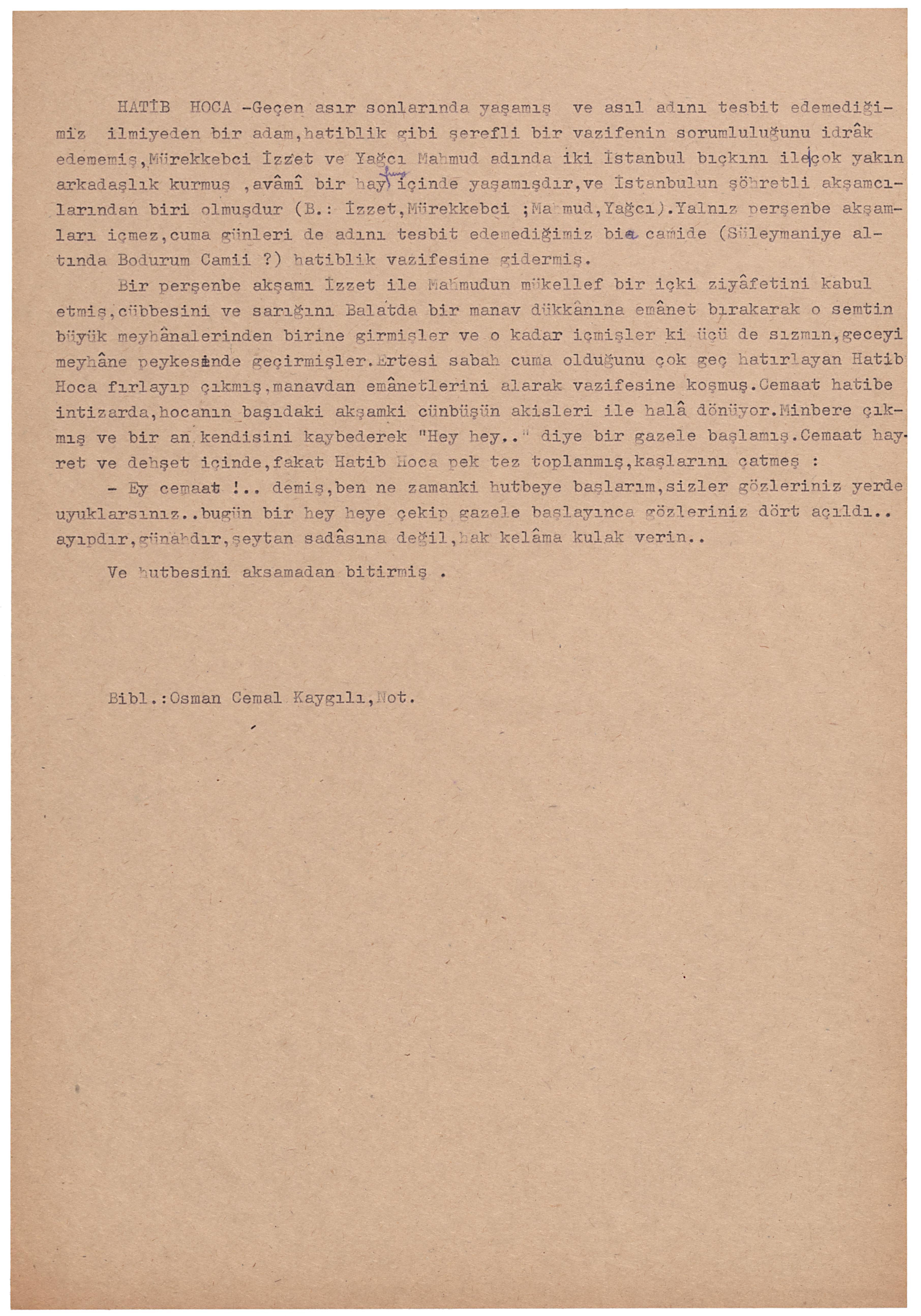 HATİB HOCA – Geçen asır sonlarında yaşamış ve asıl adını tesbit edemediğimiz ilmiyeden bir adam,hatiblik gibi şerefli bir vazifenin sorumluluğunu idrâk edememiş,Mürekkebci İzzet ve Yağcı Mahmud adında iki İstanbul bıçkını ile çok yakın arkadaşlık kurmuş ,avâmî bir hay XXXXX içinde yaşamışdır,ve İstanbulun şöhretli akşamcılarından biri olmuşdur (B.: İzzet,Mürekkebci ;Mahmud,Yağcı).Yalnız perşenbe akşamları içmez,cuma günleri de adını tesbit edemediğimiz bicamide (Süleymaniye altında Bodurum Camii ?) hatiblik vazifesine gidermiş.