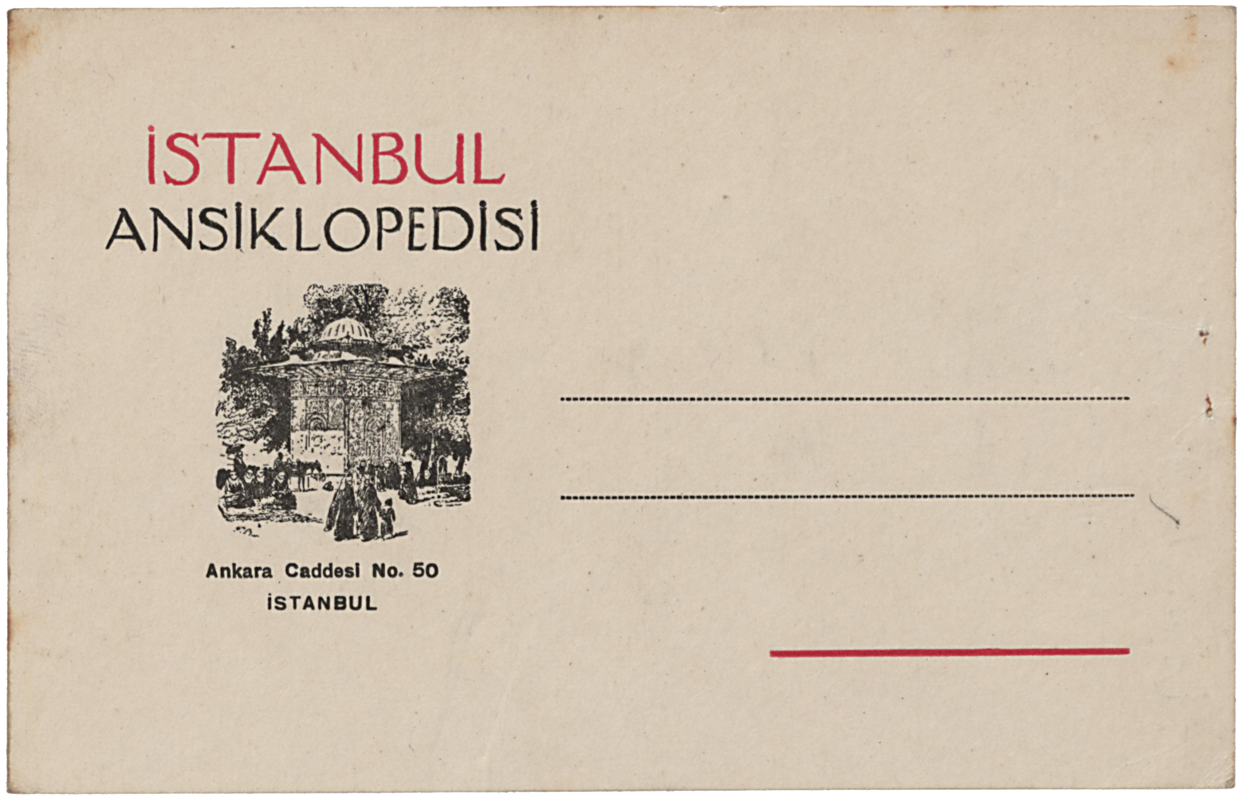 Kartpostal üzerine kurşun kalem. Notlar İstanbul Ansiklopedi Kartpostalının ön yüzüne yazılmıştır.