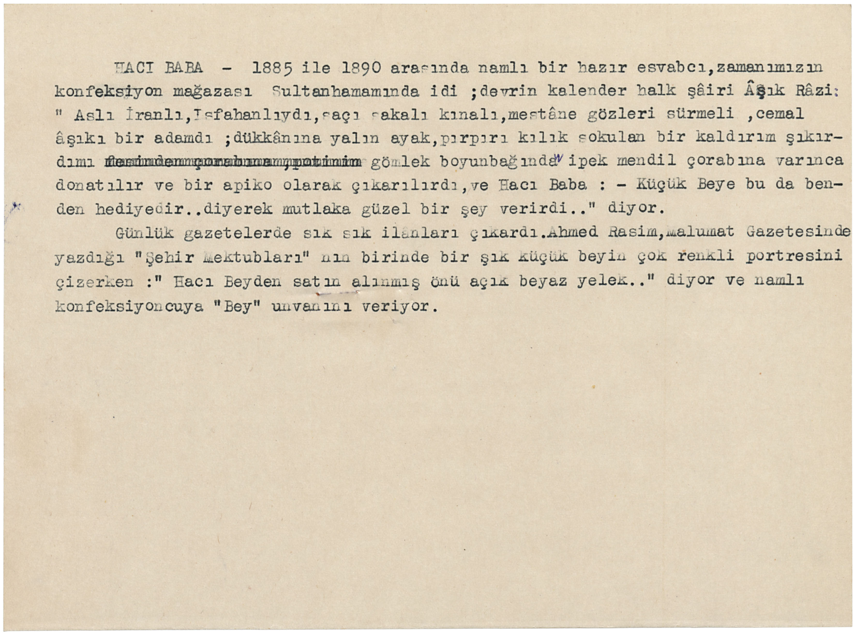 HACI BABA – 1885 ile 1890 arasında namlı bir hazır esvabcı,zamanımızın konfeksiyon mağazası Sultanhamamında idi ;devrin kalender halk şâiri Âşık Râzi: “ Aslı İranlı,Isfahanlıydı,saçı sakalı kınalı,mestâne gözleri sürmeli ,cemal âşıkı bir adamdı ;dükkânına yalın ayak,pırpırı kılık sokulan bir kaldırım şıkırdımı fesinden çorabına ,potinim gömlek boyunbağından ipek mendil çorabına varınca donatılır ve bir apiko olarak çıkarılırdı,ve Hacı Baba : - Küçük Beye bu da benden hediyedir..diyerek mutlaka güzel bir şey verirdi..” diyor.