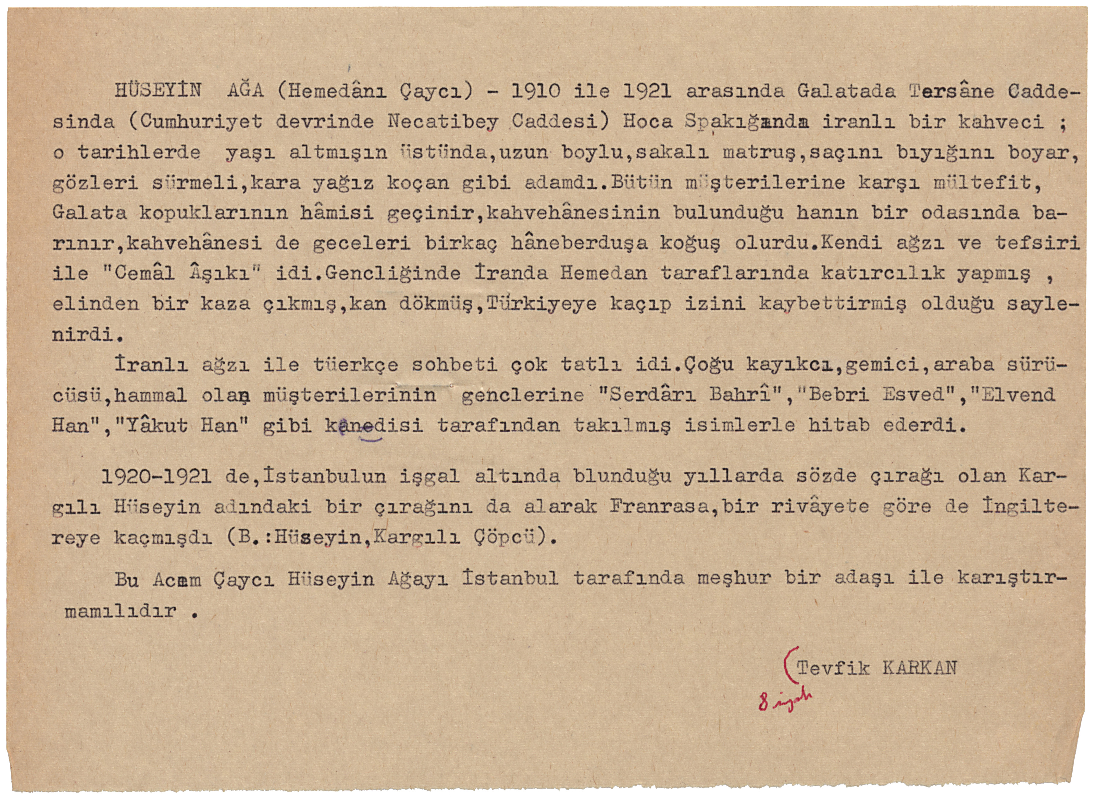 HÜSEYİN AĞA (Hemedânı Çaycı) – 1910 ile 1921 arasında Galatada Tersâne Caddesinde (Cumhuriyet devrinde Necatibey Caddesi) Hoca Spakığında İranlı bir kahveci ; o tarihlerde yaşı altmışın üstünde,uzun boylu,sakalı matruş,saçını bıyığını boyar,gözleri sürmeli,kara yağız koçan gibi adamdı.Bütün müşterilerine karşı mültefit,Galata kopuklarının hâmisi geçinir,kahvehânesinin bulunduğu hanın bir odasında barınır,kahvehânesi de geceleri birkaç hâneberduşa koğuş olurdu.Kendi ağzı ve tefsiri ile “Cemâl Âşıkı” idi.Gencliğinde İranda Hemedan taraflarında katırcılık yapmış ,elinden bir kaza çıkmış,kan dökmüş,Türkiyeye kaçıp izini kaybettirmiş olduğu saylenirdi.