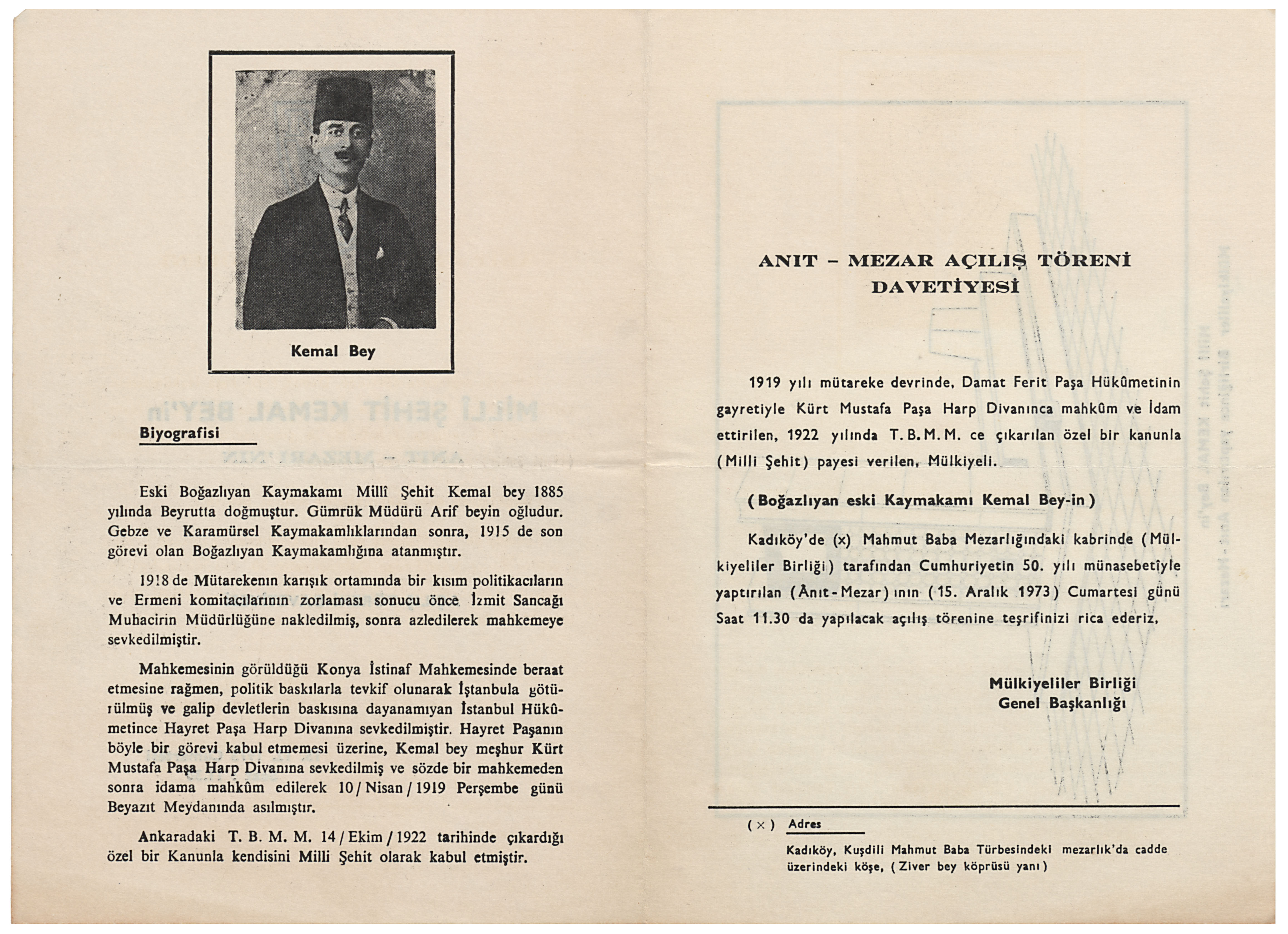 Mehmed Kemal'in anıt mezarının açılış töreni davetiyesi