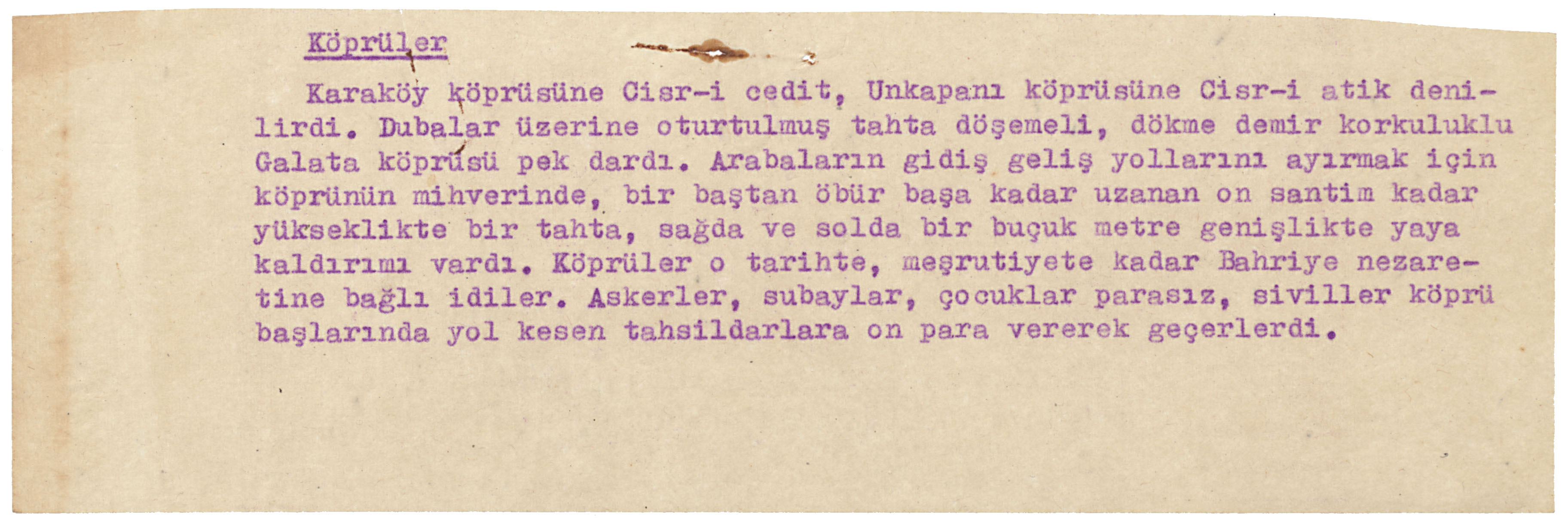 Köprü, Bridge, Köprüler, Bridges, Karaköy Köprüsü, Karaköy Bridge, Cisr-i Cedit, Unkapanı Köprüsü, Unkapanı Bridge, Cisr-i Atik, Bahriye Nezareti, Ministry of Navy, Haliç, Karakol gemisi, Police station ship, Deniz hamamı, Sea hammam, Şirket-i Hayriye, Vapur iskelesi, Ferry pier, Adalar İskelesi, Princes Islands' Pier, İlyas'ın Kitapçı Dükkanı, İlyas' Book Store