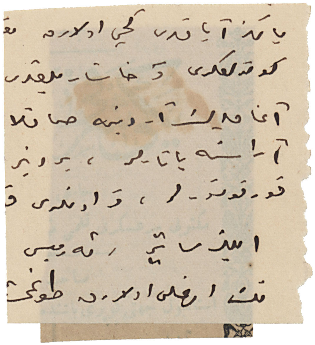 Sözlerin yer aldığı kupür kâğıda yapıştırılmıştır. Belgenin arkasında mürekkeple yazılmış yarım bir not vardır.