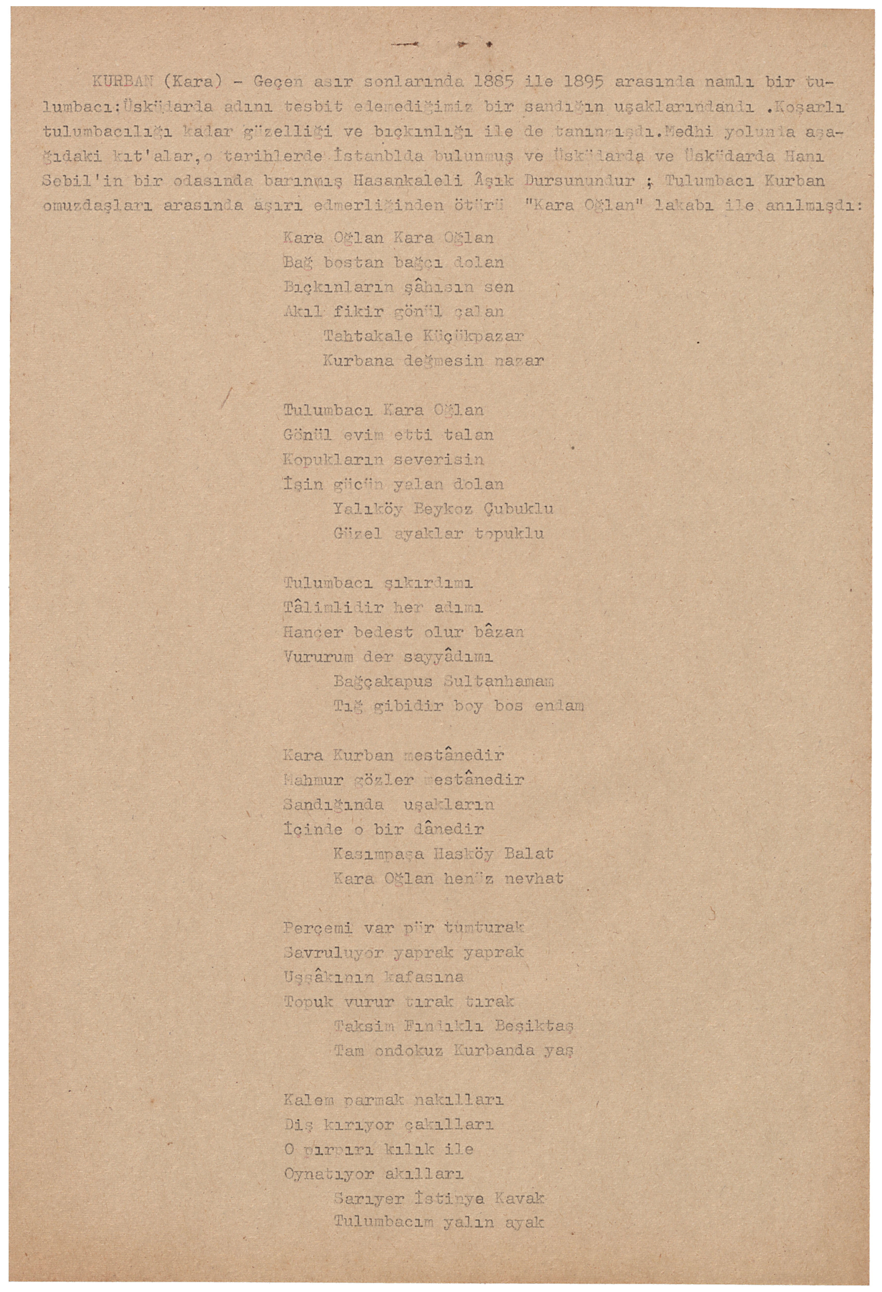 KURBAN (Kara) – Geçen asır sonlarında 1885 ile 1895 arasında namlı bir tulumbacı:Üsküdarın adını tesbit edemediğimiz bir sandığın uşaklarındandı .Koşarlı tulumbacılığı kadar güzelliği ve bıçkınlığı ile de tanınmışdı.Medhi yolunda aşağıdaki kıt'alar,o tarihlerde İstanblda bulunmuş ve Üsküdarda ve Üsküdarda Hanı Sebil'in bir odasında barınmış Hasankaleli Âşık Dursunundur ; Tulumbacı Kurban omuzdaşları arasında aşırı edmerliğinden ötürü “Kara Oğlan” lakabı ile anılmışdı: