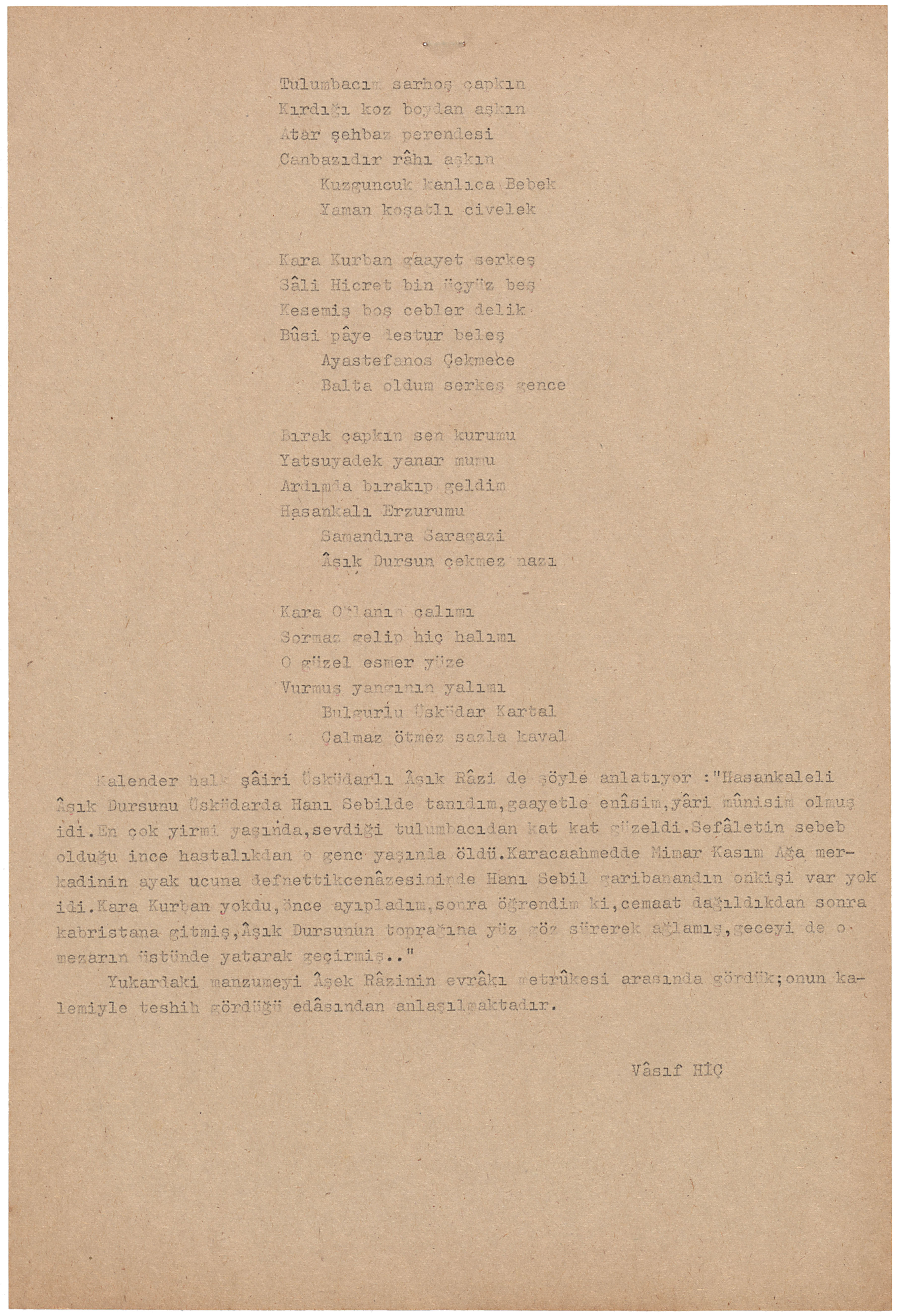 Yukardaki manzumeyi Âşek Râzinin evrâkı metrûkesi arasında gördük;onun kalemiyle teshih gördüğü edâsından anlaşılmaktadır.