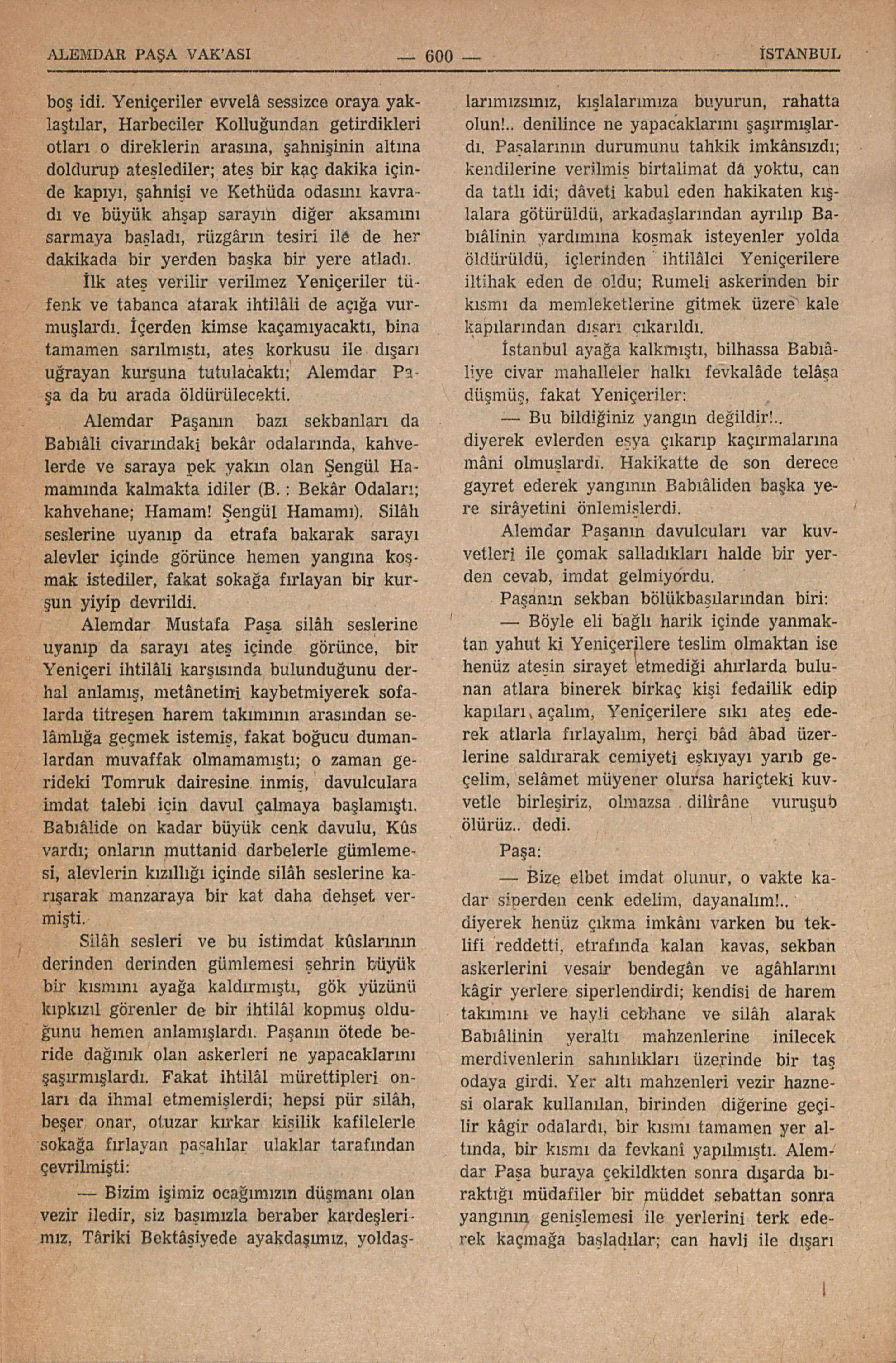 — İstanbul ayağa kalkmıştı, bilhassa Babıâliye civar mahalleler halkı fevkalâde telâşa düşmüş, fakat Yeniçeriler: