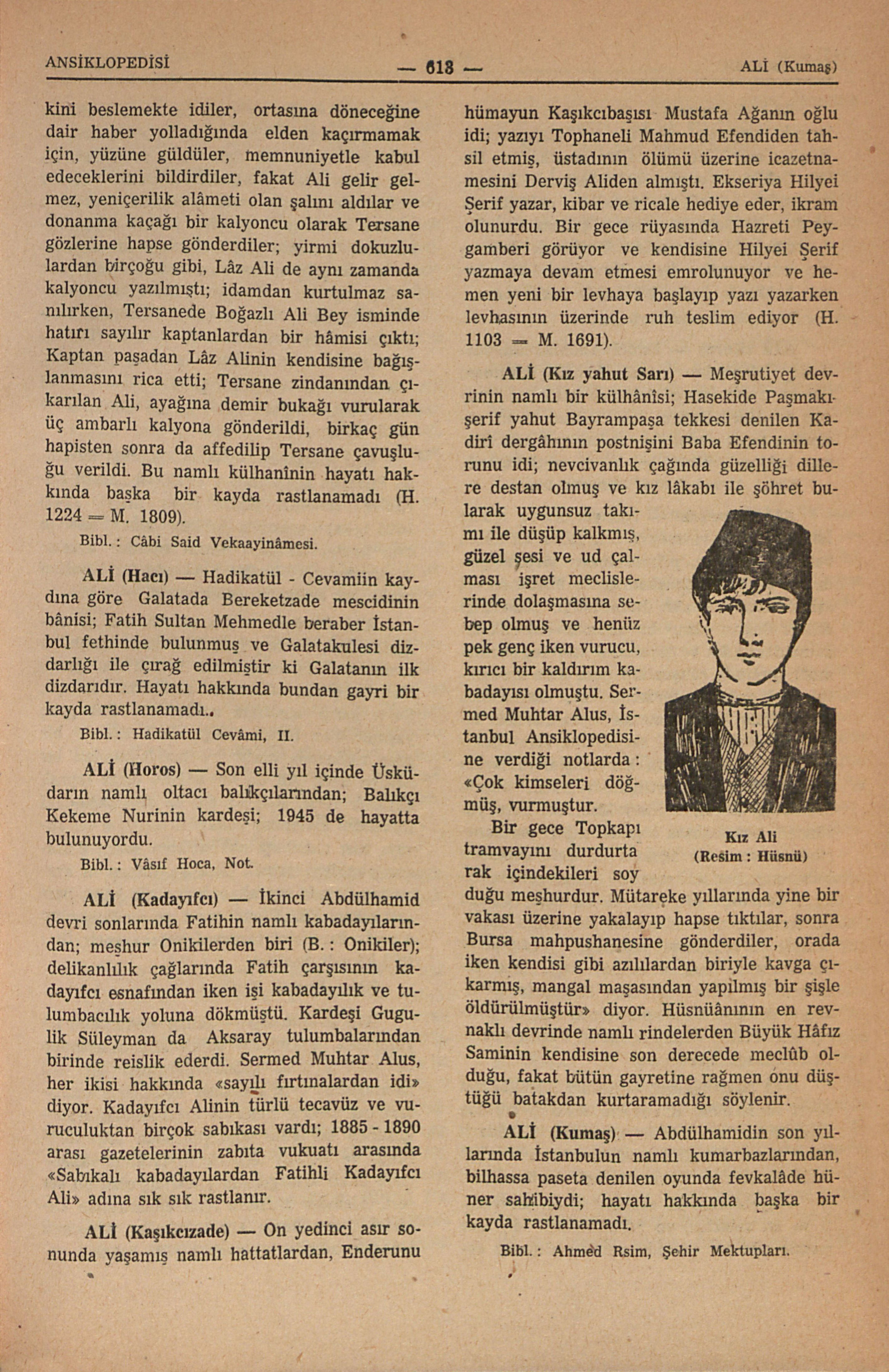 İkinci Abdülhamid devri sonlarında Fatihin namlı kabadayılarından; meşhur Onikilerden biri (B. : Onikiler); delikanlılık çağlarında Fatih çarşısının kadayıfçı esnafından iken işi kabadayılık ve tulumbacılık yoluna dökmüştü. Kardeşi Gugulik Süleyman da Aksaray tulumbalarından birinde reislik ederdi. Sermed Muhtar Alus, her ikisi hakkında «sayılı fırtınalardan idi» diyor. Kadayıfcı Alinin türlü tecavüz ve vuruculuktan birçok sabıkası vardı; 1885 - 1890 arası gazetelerinin zabıta vukuatı arasında «Sabıkalı kabadayılardan Fatihli Kadayıfcı Ali» sık sık rastlanır.