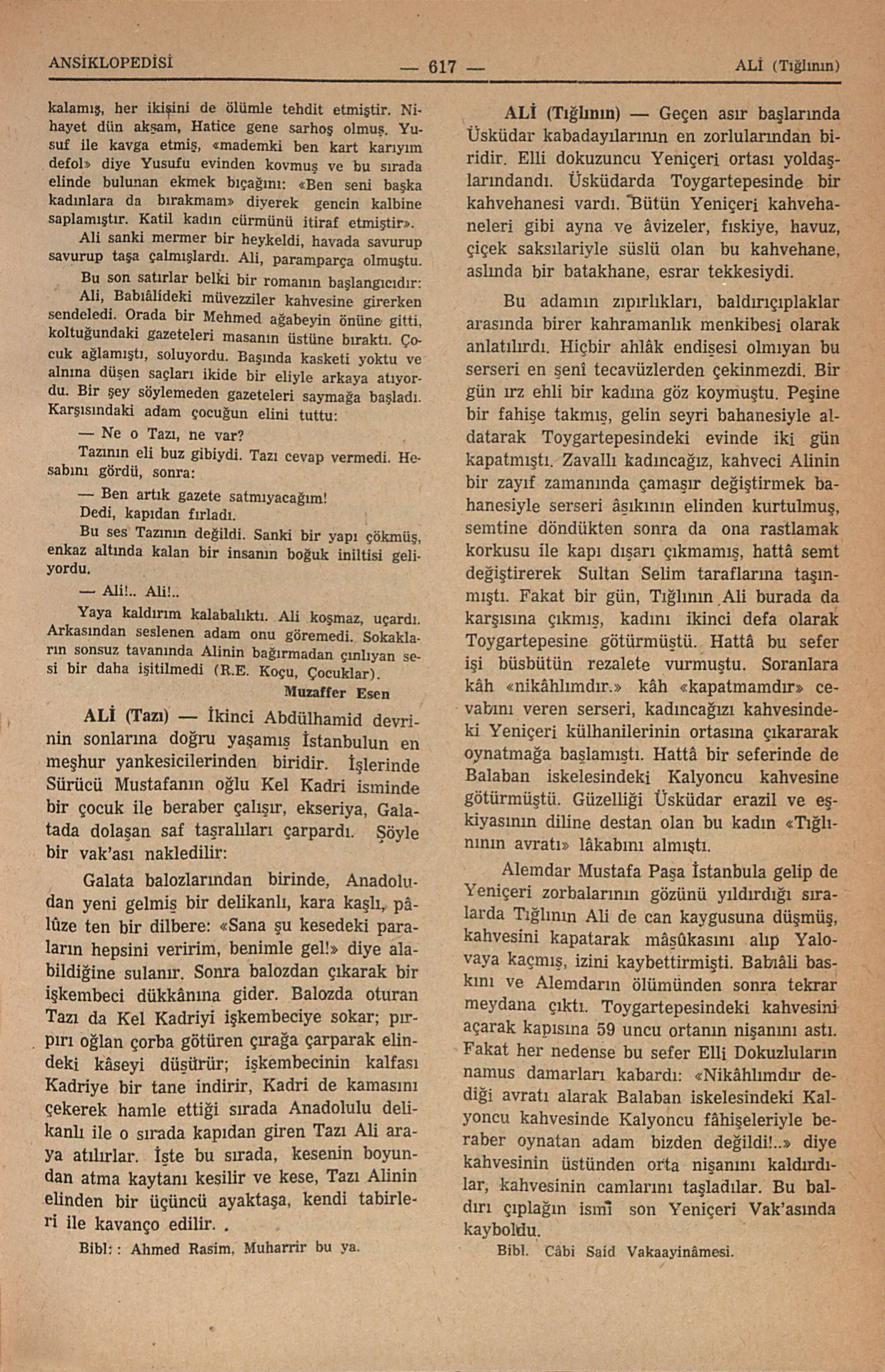 Bu adamın zıpırlıkları, baldırıçıplaklar arasında birer kahramanlık menkibesi olarak anlatılırdı. Hiçbir ahlâk endişesi olmıyan bu serseri ve şenî tecavüzlerden çekinmezdi. Bir gün ırz ehli bir kadına göz koymuştu. Peşine bir fahişe takmış, gelin seyri bahanesiyle aldatarak Toygartepesindeki evinde iki gün kapatmıştı. Zavallı kadıncağız, kahveci Alinin bir zayıf zamanında çamaşır değiştirmek bahanesiyle serseri âşıkının elinden kurtulmuş, semtine döndükten sonra da ona rastlamak korkusu ile kapı dışarı çıkmamış, hattâ semt değiştirerek Sultan Selim taraflarına taşınmıştı. Fakat bir gün, Tığlının Ali burada da karşısına çıkmış, kadını ikinci defa olarak Toygartepesine götürmüştü. Hattâ bu sefer işi büsbütün rezalete vurmuştu. Soranlara kâh «nikâhlımdır.» kâh «kapatmamdır» cevabını veren serseri, kadıncağızı kahvesindeki Yeniçeri külhanilerinin ortasına çıkararak oynatmağa başlamıştı. Hattâ bir seferinde de Balaban iskelesindeki Kalyoncu kahvesine götürnmüştü. Güze...