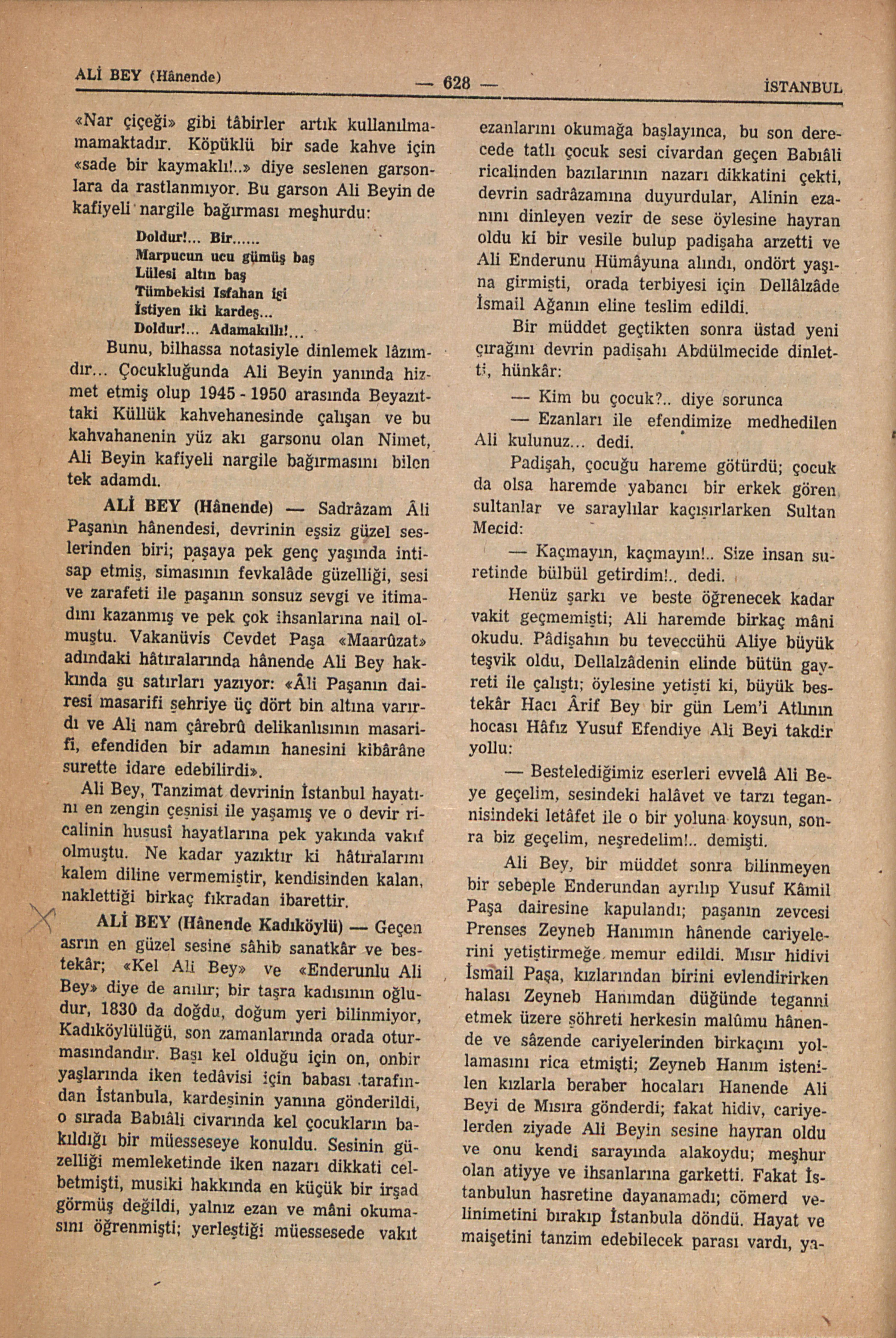 Sadrâzam Âli Paşanın hânendesi, devrinin eşsiz güzel seslerinden biri; paşaya pek genç yaşında intisap etmiş, simasının fevkalâde güzelliği, sesi ve zarafeti ile paşanın sonsuz sevgi ve itimadını kazanmış ve pek çok ihsanlarına nail olmuştu. Vakanüvis Cevdet Paşa «Maarûzat» adındaki hâtıralarında hânende Ali Bey hakkında şu satırları yazıyor: «Âli Paşanın dairesi masarifi şehriye üç dört bin altına varırdı ve Ali nam çârebrû delikanlısının masarifi, efendiden bir adamın hanesini kibârâne surette idare edebilirdi». Ali Bey, Tanzimat devrinin İstanbul hayatını en zengin çeşnisi ile yaşamış ve o devir ricalinin hususî hayatlarına pek yakında vakıf olmuştu. Ne kadar yazıktır ki hâtıralarını kalem diline vermemiştir, kendisinden kalan, naklettiği birkaç fıkradan ibarettir.
