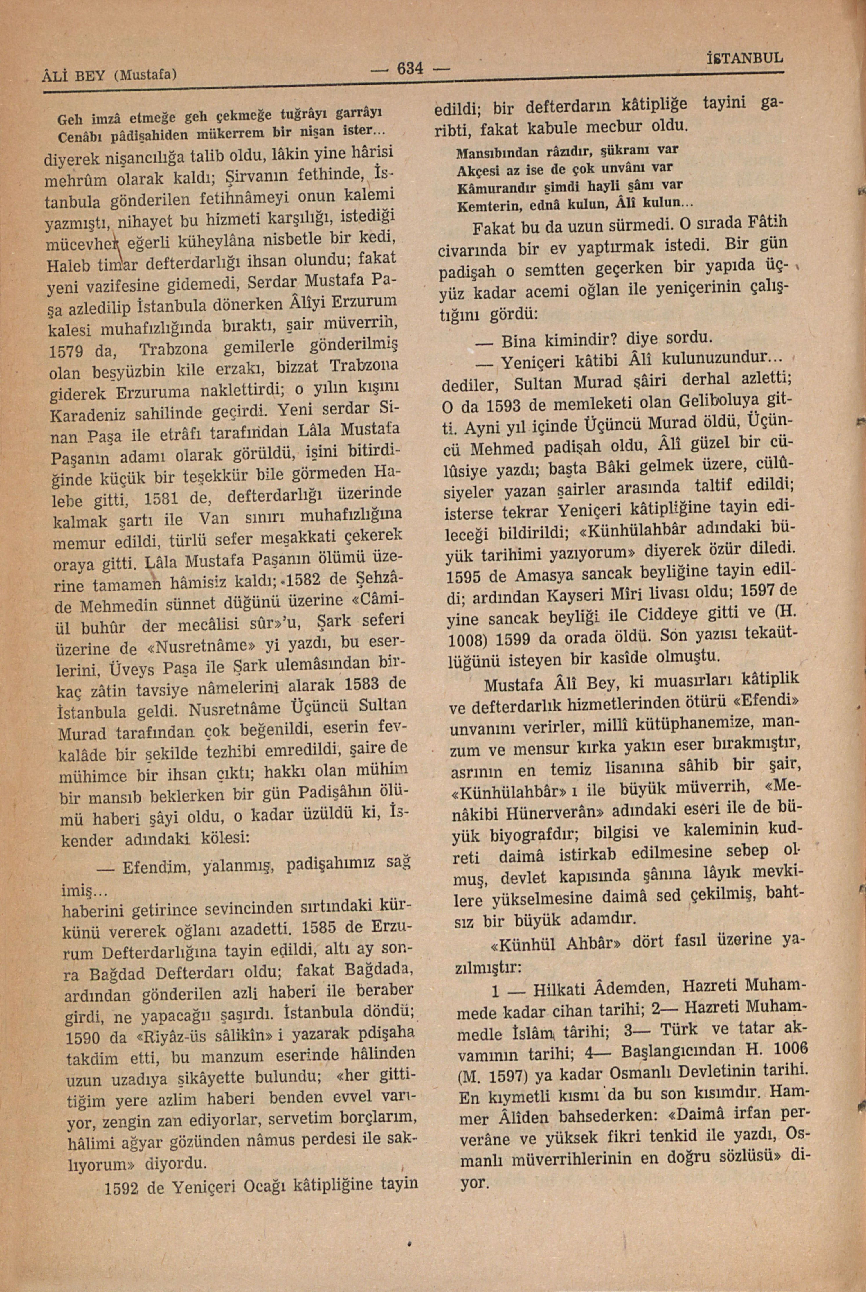 Mustafa Âli Bey, ki muasırları kâtiplik ve defterdarlık hizmetlerinden ötürü «Efendi» unvanını verirler, millî kütüphanemize, manzum ve mensur kırka yakın eser bırakmıştır, asrının en temiz lisanına sâhib bir şair, «Künhülahbâr» ı ile büyük müverrih, «Menâkibi Hünerverân» adındaki eseri ile de büyük biyografdır; bilgisi ve kaleminin kudreti daimâ istirkab edilmesine sebep olmuş, devlet kapısında şânına lâyık mevkilere yükselmesine daimâ sed çekilmiş, bahtsız bir büyük adamdır.
