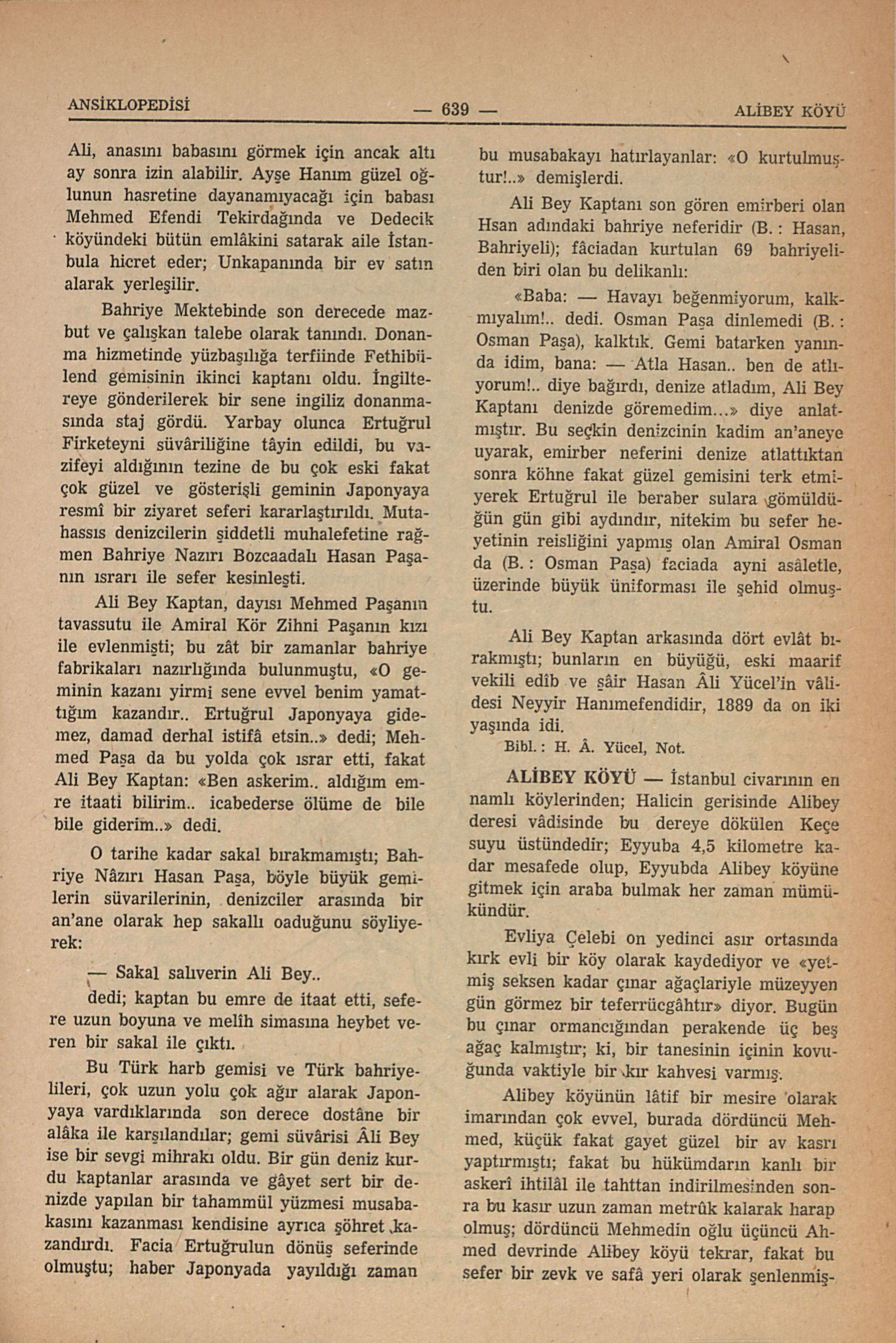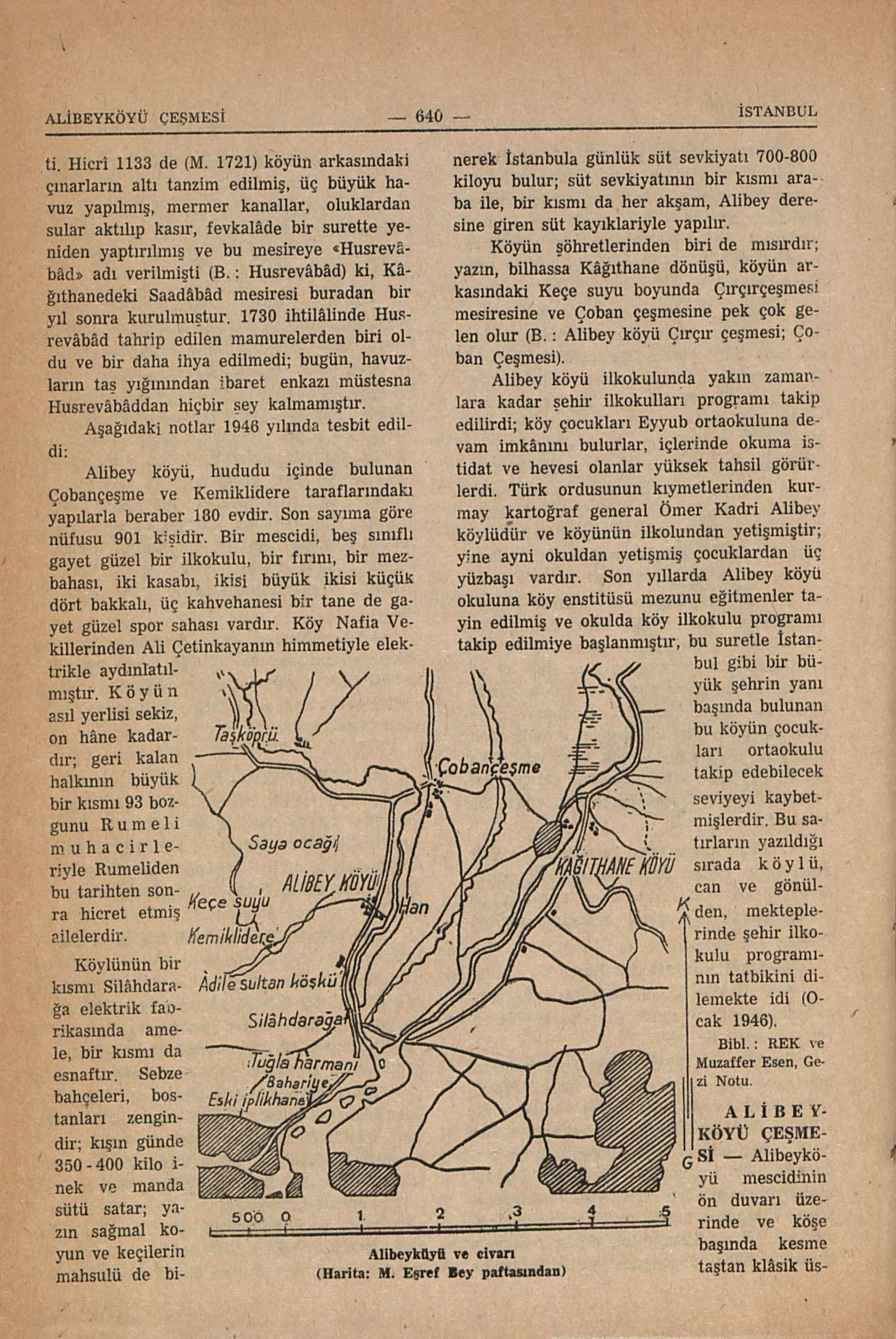 İstanbul civarının en namlı köylerinden; Halicin gerisinde Alibey deresi vâdisinde bu dereye dökülen Keçe suyu üstündedir; Eyyuba 4,5 kilometre kadar mesafede olup, Eyyubda Alibey köyüne gitmek için araba bulmak her zaman mümkündür. Evliya Çelebi on yedinci asır ortasında kırk evli bir köy olarak kaydediyor ve «yetmiş seksen kadar çınar ağaçlariyle müzeyyen gün görmez bir teferrücgâhtır» diyor. Bugün bu çınar ormancığından perakende üç beş ağaç kalmıştır; ki, bir tanesinin içinin kovuğunda vaktiyle bir kır kahvesi varmış. Alibey köyünün lâtif bir mesire olarak imarından çok evvel, burada dördüncü Mehmed, küçük fakat gayet güzel bir av kasrı yaptırmıştı; fakat bu hükümdarın kanlı bir askerî ihtilâl ile tahttan indirilmesinden sonra bu kasır uzun zaman metrûk kalarak harap olmuş; dördüncü Mehmedin oğlu üçüncü Ahmed devrinde Alibey köyü tekrar, fakat bu sefer bir zevk ve safâ yeri olarak şenlenmişti. Hicrî 1133 de (M. 1721) köyün arkasındaki çınarların altı tanzim edilmiş, üç büyük havuz yapılmış, mermer kanallar, oluklardan sular aktılıp kasır, fevkalâde bir surette yeniden yaptırılmış ve bu mesireye «Husrevâbâd» adı verilmişti (B. : Husrevâbâd) ki, Kâğıthanedeki Saadâbâd mesiresi buradan bir yıl sonra kurulmuştur. 1730 ihtilâlinde Husrevâbâd tahrip edilen mamurelerden biri oldu ve bir daha ihya edilmedi; bugün, havuzların taş yığınından ibaret enkazı müstesna Husrevâbâddan hiçbir şey kalmamıştır. Aşağıdaki notlar 1946 yılında tesbit edildi: Alibey köyü, hududu içinde bulunan Çobançeşme ve Kemiklidere taraflarındaki yapılarla beraber 180 evdir. Son sayıma göre nüfusu 901 kişidir. Bir mescidi, beş sınıflı gayet güzel bir ilkokulu, bir fırını, bir mezbahası, iki kasabı, ikisi büyük ikisi küçük dört bakkalı, üç kahvehanesi bir tane de gayet güzel spor sahası vardır. Köy Nafia Vekillerinden Ali Çetinkayanın himmetiyle elektrikle aydınlatılmıştır. Köyün asıl yerlisi sekiz, on hâne kadardır; geri kalan halkının büyük bir kısmı 93 bozgunu Rumeli muhacirleriyle Rumeliden bu tarihten sonra hicret etmiş ailelerdir. Köylünün bir kısmı Silâhdarağa elektrik fabrikasında amele, bir kısmı da esnaftır. Sebze bahçeleri, bostanları zengindir; kışın günde 350 - 400 kilo inek ve manda sütü satar; yazın sağmal koyun ve keçilerin mahsulü de binerek İstanbula günlük süt sevkiyatı 700-800 kiloyu bulur; süt sevkiyatının bir kısmı araba ile, bir kısmı da her akşam, Alibey deresine giren süt kayıklariyle yapılır. Köyün şöhretlerinden biri de mısırdır; yazın, bilhassa Kâğıthane dönüşü, köyün arkasındaki Keçe suyu boyunda Çırçırçeşmesi mesiresine ve Çoban çeşmesine pek çok gelen olur (B. : Alibey köyü Çırçır çeşmesi, Çoban Çeşmesi). Alibey köyü ilkokulunda yakın zamanlara kadar şehir ilkokulları programı takip edilirdi; köy çocukları Eyyub ortaokuluna devam imkânını bulurlar, içlerinde okuma istidat ve hevesi olanlar yüksek tahsil görürlerdi. Türk ordusunun kıymetlerinden kurmay kartoğraf general Ömer Kadri Alibey köylüdür ve köyünün ilkokulundan yetişmiştir; yine ayni okuldan yetişmiş çocuklardan üç yüzbaşı vardır. Son yıllarda Alibey köyü okuluna köy enstitüsü mezunu eğitmenler tayin edilmiş ve okulda köy ilkokulu programı takip edilmiye başlanmıştır, bu suretle İstanbul gibi bir büyük şehrin yanı başında bulunan bu köyün çocukları ortaokulu takip edebilecek seviyeyi kaybetmişlerdir. Bu satırların yazıldığı sırada köylü, can ve gönülden, mekteplerinde şehir ilkokulu programının tatbikini dilemekte idi (Ocak 1946). Bibl. : REK ve Muzaffer Esen, Gezi Notu. Alibeyköyü ve civarı (Harita: M. Eşref Bey paftasından) Eyyubda Karyağdı Bayırından Halicin görünüşü ve İstanbul panoraması (Resim : H. Bartlett) Ayasofyada mermer küp ve genç hâfız (Warwick Goble’nin suluboya resminden S. Bozcalı eli ile)