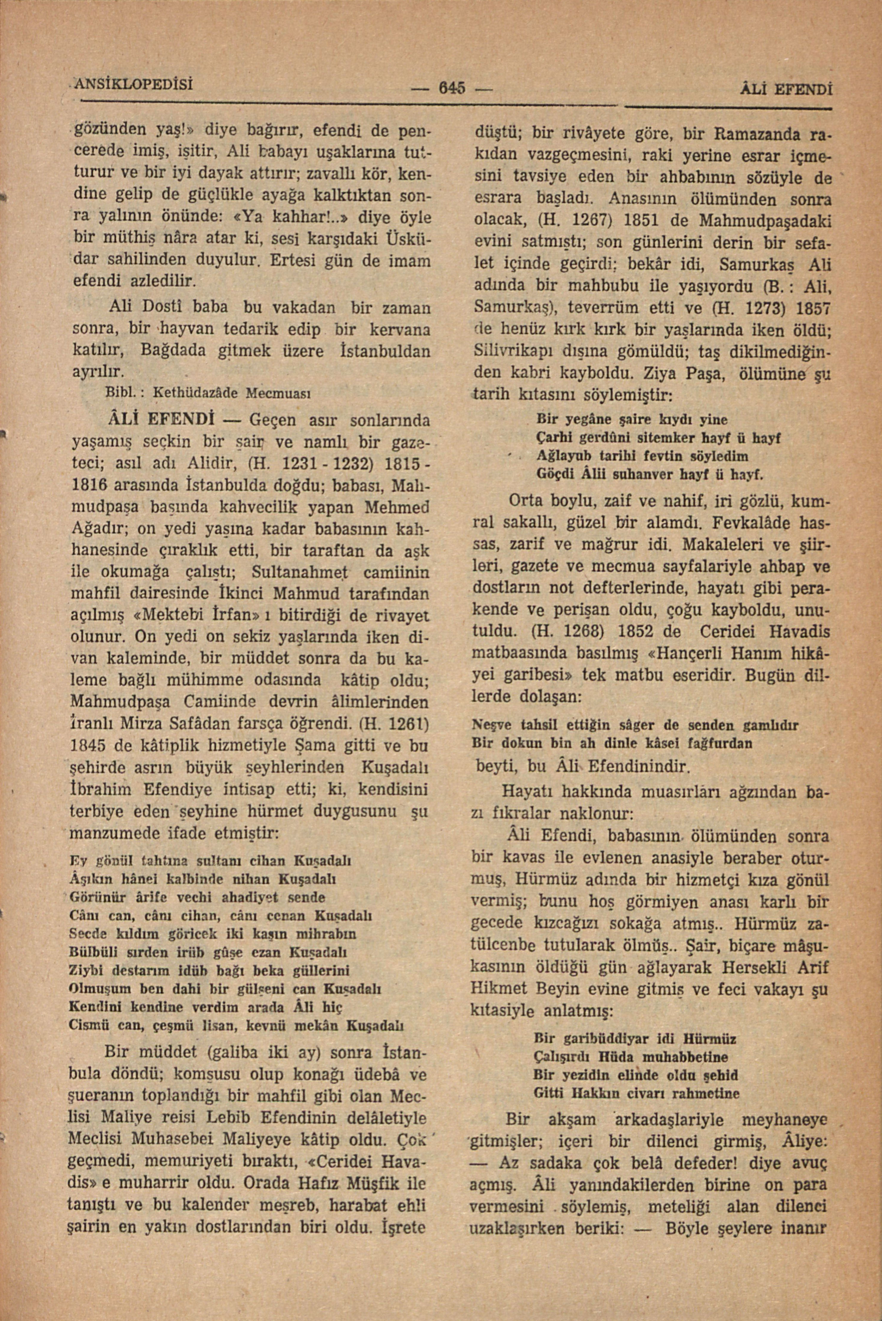 Geçen asır sonlarında yaşamış seçkin bir şair ve namlı birgazeteci; asıl adı Alidir, (H. 1231 - 1232) 1815 - 1816 arasında İstanbulda doğdu; babası, Mahmudpaşa başında kahvecilik yapan Mehmed Ağadır; on yedi yaşına kadar babasının kahhanesinde çıraklık etti, bir taraftan da aşk ile okumağa çalıştı; Sultanahmet camiinin mahfil dairesinde İkinci Mahmud tarafından açılmış «Mektebi İrfan” ı bitirdiği de rivayet olunur. On yedi on sekiz yaşlarında iken divan kaleminde, bir müddet sonra da bu kaleme bağlı mühimme odasında kâtip oldu; Mahmudpaşa Camiinde devrin âlimlerinden İranlı Mirza Safâdan Farsça öğrendi. (H. 1261) 1845 de kâtiplik hizmetiyle Şama gitti ve bu şehirde asrın büyük şeyhlerinden Kuşadalı İbrahim Efendiye intisap etti; ki, kendisini terbiye eden şeyhine hürmet duygusunu şu manzumede ifade etmiştir: Ey gönül tahtına sultanı cihan Kuşadalı Âşıkın hânei kalbinde nihan Kuşadalı Görünür ârife vechi ahadiyet sende Cânı can, cânı cihan, cânı cenan Kuşadalı Secde kıldım göricek iki kaşın mihrabın Bülbüli sırden irüb gûşe ezan Kuşadalı Ziybi destarım idüb bağı beka güllerini Olmuşum ben dahi bir gülşeni can Kuşadalı Kendini kendine verdim arada Âli hiç Cismü can, çeşmü lisan, kevnü mekân Kuşadalı Bir müddet (galiba iki ay) sonra İstanbula döndü; komşusu olup konağı üdebâ ve şueranın toplandığı bir mahfil gibi olan Meclisi Maliye reisi Lebib Efendinin delâletiyle Meclisi Muhasebei Maliyeye kâtip oldu. Çok geçmedi, memuriyeti bıraktı, «Ceridei Havadis” e muharrir oldu. Orada Hafız Müşfik ile tanıştı ve bu kalender meşreb, harabat ehli şairin en yakın dostlarından biri oldu. İşrete düştü; bir rivâyete göre, bir Ramazanda rakıdan vazgeçmesini, raki yerine esrar içmesini tavsiye eden bir ahbabının sözüyle de esrara başladı. Anasının ölümünden sonra olacak, (H. 1267) 1851 de Mahmudpaşadaki evini satmıştı; son günlerini derin bir sefalet içinde geçirdi; bekâr idi, Samurkaş Ali adında bir mahbubu ile yaşıyordu (B. : Ali, Samurkaş), teverrüm etti ve (H. 1273) 1857 de henüz kırk kırk bir yaşlarında iken öldü; Silivrikapı dışına gömüldü; taş dikilmediğinden kabir kayboldu. Ziya Paşa, ölümüne şu tarih kıtasını söylemiştir: Bir yegâne şaire kıydı yine Çarhi gerdûni sitemker hayf ü hayf Ağlayub tarihi fevtin söyledim Göçdi Âlii suhanver hayf ü hayf. Orta boylu, zaif ve nahif, iri gözlü, kumral sakallı, güzel bir alamdı. Fevkalâde hassas, zarif ve mağrur idi. Makaleleri ve şiirleri, gazete ve mecmua sayfalariyle ahbap ve dostların not defterlerinde, hayatı gibi perakende ve perişan oldu, çoğu kayboldu, unutuldu. (H. 1268) 1852 de Ceridei Havadis matbaasında basılmış «Hançerli Hanım hikâyei garibesi” tek matbu eseridir. Bugün dillerde dolaşan: Neşve tahsil ettiğin sâger de senden gamlıdır Bir dokun bin ah dinle kâsei fağfurdan beyti, bu Âli Efendinindir. Hayatı hakkında muasırları ağzından bazı fıkralar naklonur: Âli Efendi, babasının ölümünden sonra bir kavas ile evlenen anasiyle beraber oturmuş, Hürmüz adında bir hizmetçi kıza gönül vermiş; bunu hoş görmiyen anası karlı bir gecede kızcağızı sokağa atmış.. Hürmüz zatülcenbe tutularak ölmüş.. Şair, biçare mâşukasının öldüğü gün ağlayarak Hersekli Arif Hikmet Beyin evine gitmiş ve feci vakayı şu kıtasiyle anlatmış: Bir garibüddiyar idi Hürmüz Çalışırdı Hüda muhabbetine Bir yezidin elinde oldu şehid Gitti Hakkın civarı rahmetine Bir akşam arkadaşlariyle meyhaneye gitmişler; içeri bir dilenci girmiş, Âliye: — Az sadaka çok belâ defeder! diye avuç açmış. Âli yanındakilerden birine on para vermesini söylemiş, meteliği alan dilenci uzaklaşırken beriki: — Böyle şeylere inanır mısın? diye sormuş, Âli; — İşte, sadakayı verdik, belâ defoldu! demiş. Bibl. : Mecmuai Ebüzziya; Tarih Encümeni Mecmuasında İbnülemin Mahmud Kemal İnalin Âli Efendi Makalesi.